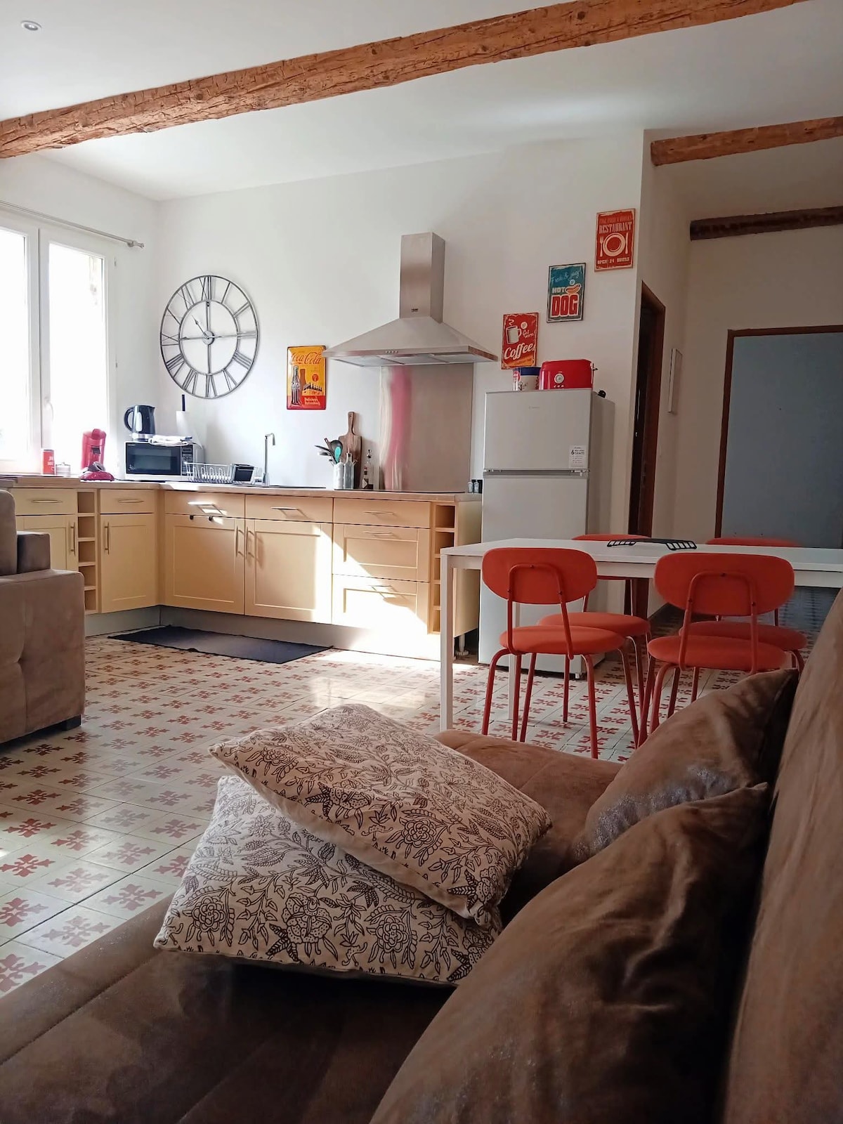 Casa adosada de 30 m² con terraza privada - Acceso seguro - Todas las comodidades (aire acondicionado, wifi...) - Café (Senséo)/té de cortesía, mermelada casera - Cocina totalmente equipada No siempre estoy, pero en ese caso, código para la puerta de entrada. Vivimos justo al lado. Se admiten animales limpios y agradables. Si vienes es porque te gustan los animales, las casas extravagantes, la decoración a veces vintage, las mesas de formica, sentirte como en casa con armarios que no están vacíos, y la calma...