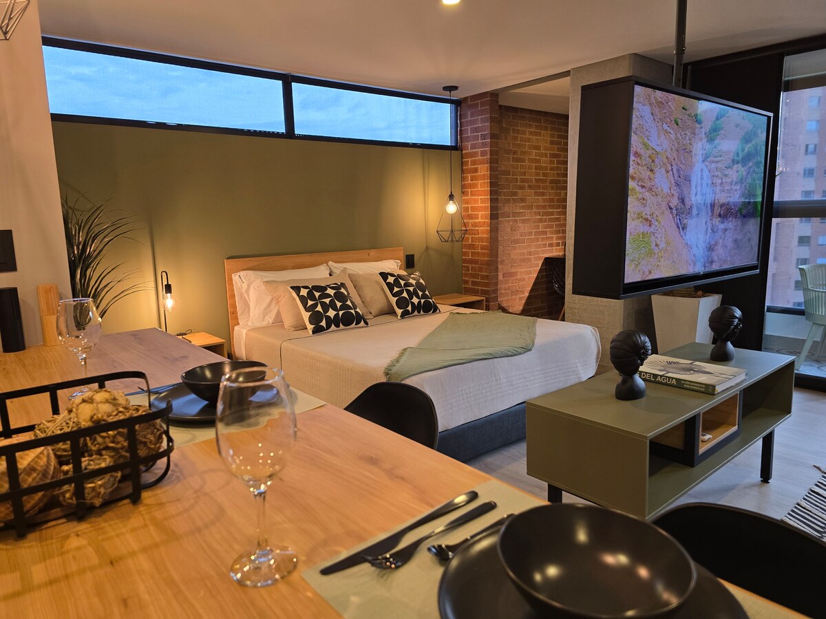 Take it easy at this unique and tranquil getaway. This beautiful, modern new 50 m² studio is ready for you. Near from ATMs, Grocery stores, Restaurants, and Cafes. 10 minutes walking to the night party in Provenza and Park Lleras. King bed, A/C, Netflix, amazing view from 14th floor, gym in the building, parking load, security 24/7. *Zero tolerance against sexual tourism. *Please see our house rules. *If you are Colombian resident you must pay IVA 19% additional.