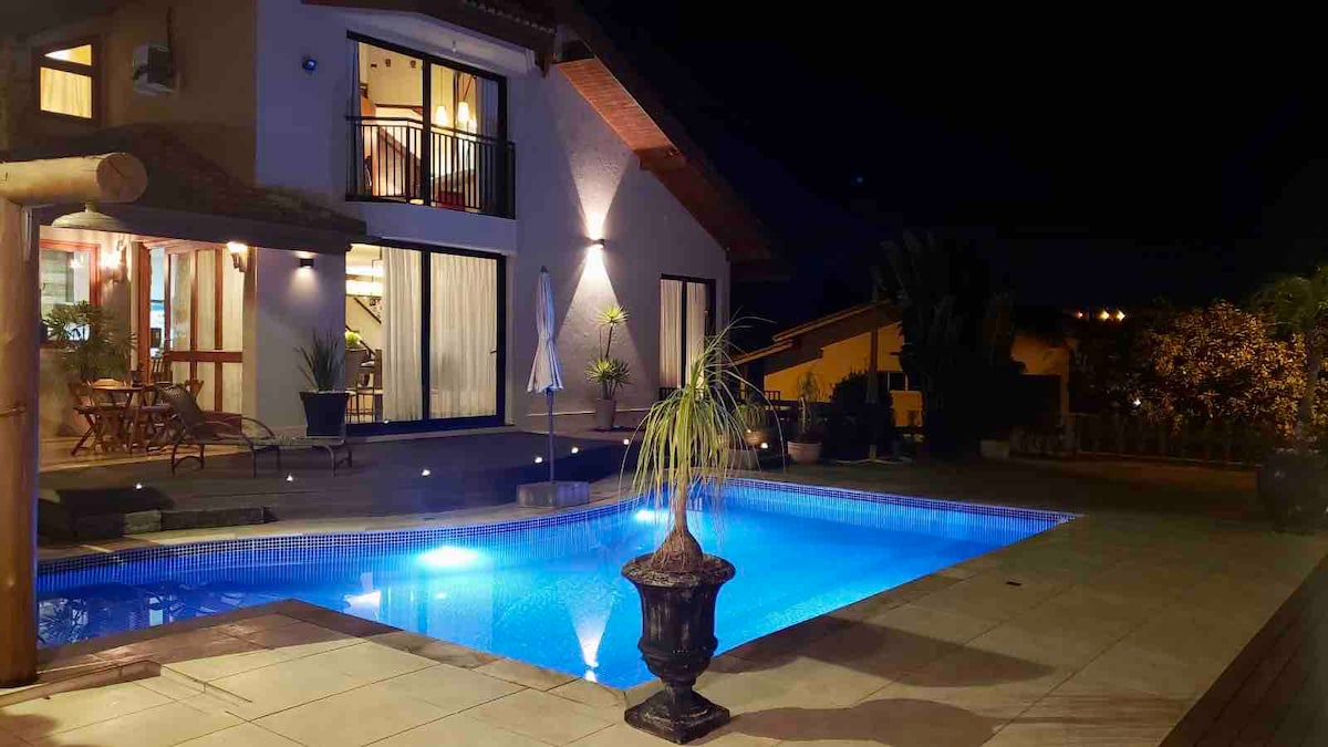 ¡Bienvenido a mi casa! Casa bien decorada, equipada, cómoda y acogedora para recibirte con mucho cariño. Situada en un condominio cerrado, es una excelente opción para reunir a familiares y amigos junto a la chimenea o fogata en los días de invierno. En los días soleados, piscina climatizada (solar) e iluminada con una amplia terraza. Para los amantes de la gastronomía, la casa ofrece parrilla, estufa y horno de leña. Nota: ¡SOLO HAY AIRE ACONDICIONADO EN UNA HABITACIÓN, EN LAS DEMÁS HAY CLIMATIZADORES DE AIRE!