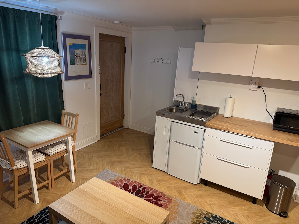 Ubicado en una zona céntrica, este apartamento eficiente en el primer piso recientemente renovado cuenta con un amplio baño con tocadores dobles. Incluye una cama tamaño king y un sofá cama de espuma viscoelástica tamaño queen. La moderna cocina pequeña está equipada con encimera, nevera y fregadero. Disfruta del entretenimiento con un televisor de 55"y mantente conectado con WiFi gratuito y rápido. Un nuevo aire acondicionado/calentador mini-split garantiza comodidad durante todo el año. Disfruta de la zona de estar al aire libre. También se proporciona estacionamiento fuera de la calle.