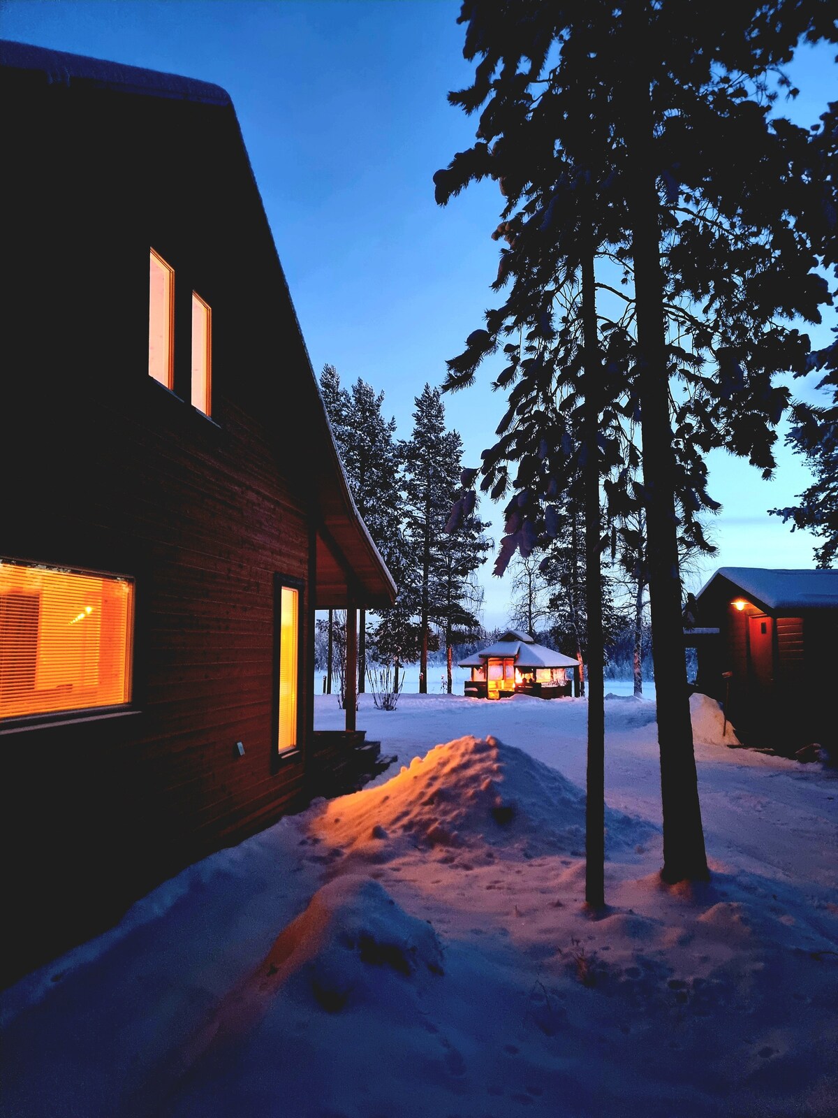 Cabaña de madera única con bañera de hidromasaje y sauna. Un dormitorio dentro de la cabaña y un dormitorio fuera en el anexo. El sendero para motos de nieve pasa justo por delante de la cabaña. Oportunidades para la caza, el esquí, la pesca y el senderismo. También hay un pequeño barco y una canoa. Cuando llega la noche, es posible encender el jacuzzi y la sauna y disfrutar del «spa en la naturaleza».