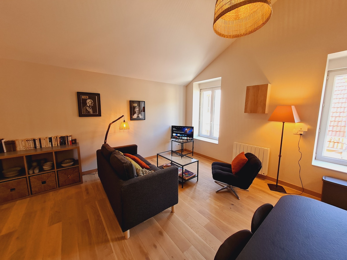 Cosy et chaleureux appartement climatisé au cœur des vignes de Meursault. Vue magnifique, terrasse privée, belle salle de bains avec toilettes separés, cuisine équipée (four, frigo, lave vaisselle, cafetière Nespresso, bouilloire...) parking privatif 2 voitures gratuit. Fer et table à repasser, lave linge dans l’appartement. Idéal 2 personnes. Nettoyage et désinfection selon protocole strict lutte contre covid 19.