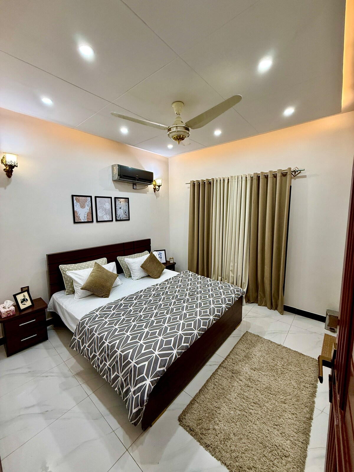 Escape to comfort in this luxurious villa in Bahria Town Karachi. Featuring spacious bedrooms with attached baths, a modern kitchen, stylish living & dining areas, and a private terrace, this home is perfect for families or groups. Located in a secure gated community with 24/7 security, parks, cafes, and supermarkets nearby. Enjoy a peaceful stay with all the amenities you need for short or long visits. Special ramzan 55% off on prices.