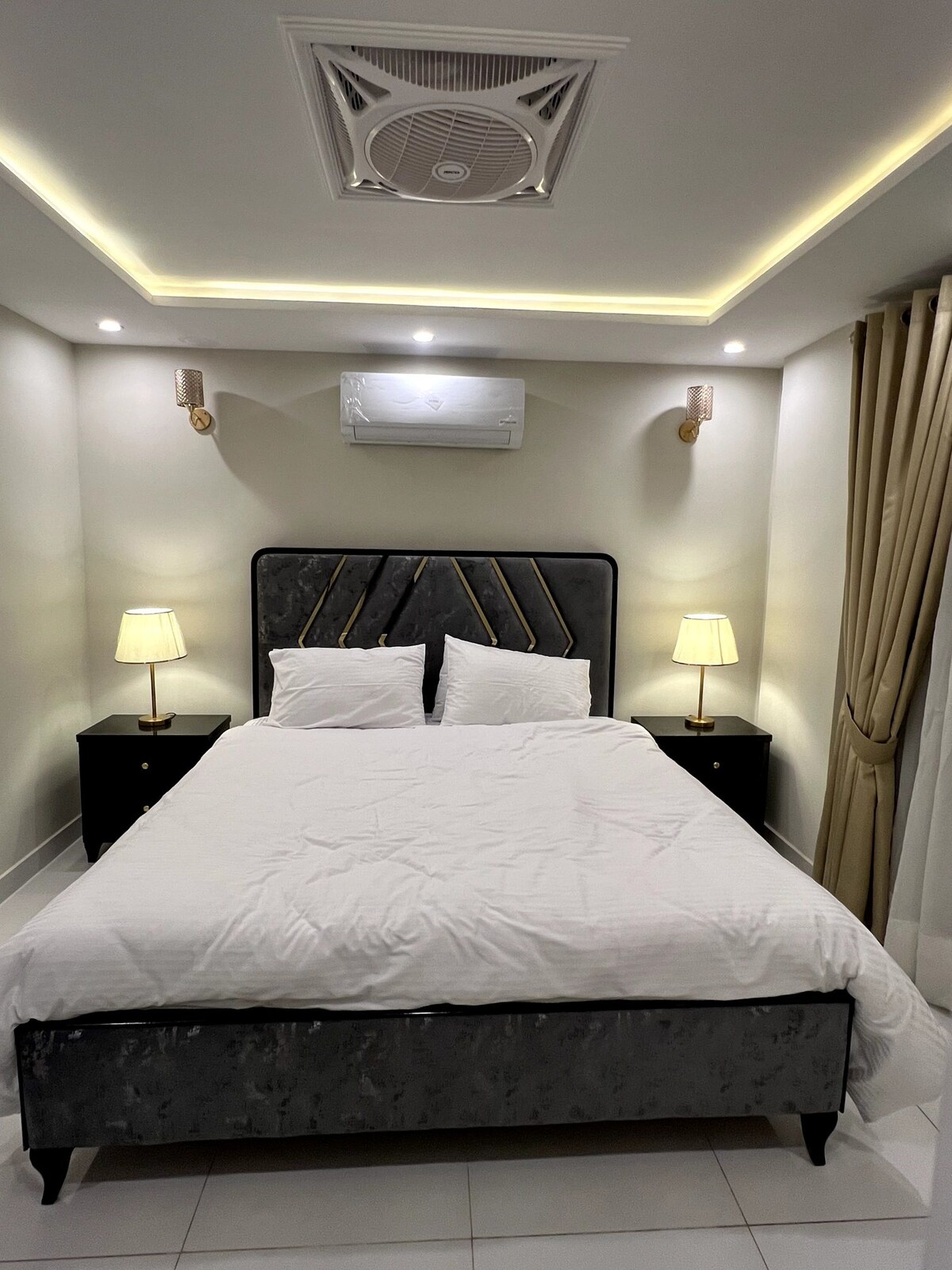 Enjoy the perfect balance of comfort, style, and affordability in this modern apartment located in the heart of Bahria Town, Lahore. ✨ What You’ll Love: • Spacious, fully furnished aprtment • Comfortable bedroom with soft bedding & fresh linens • Modern kitchen with essentials for easy cooking • High-speed WiFi & smart TV for your entertainment • Secure & peaceful environment in Bahria Town