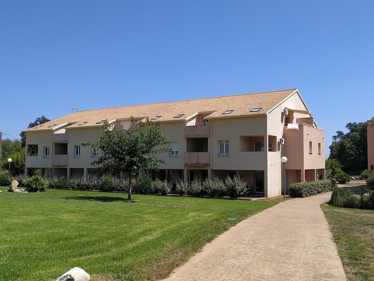Pequeño nido nuevo, luminoso, super equipado (cilla (cama 160) con aire acondicionado en residencia privada, tranquilo, vistas despejadas a la montaña. 2 terrazas, 1 jardín para compartir las comidas fuera, tomar el sol. APARCAMIENTO gratuito. Se proporcionan toallas y sábanas. ¡Del mar a la montaña hay solo un paso (10/15 min) en coche! Ideal para 2 para una estancia inolvidable para disfrutar de las 8 playas más cercanas o de los magníficos circuitos del bosque BONIFATO, la ciudadela de Calvi, la gastronomía, la historia.