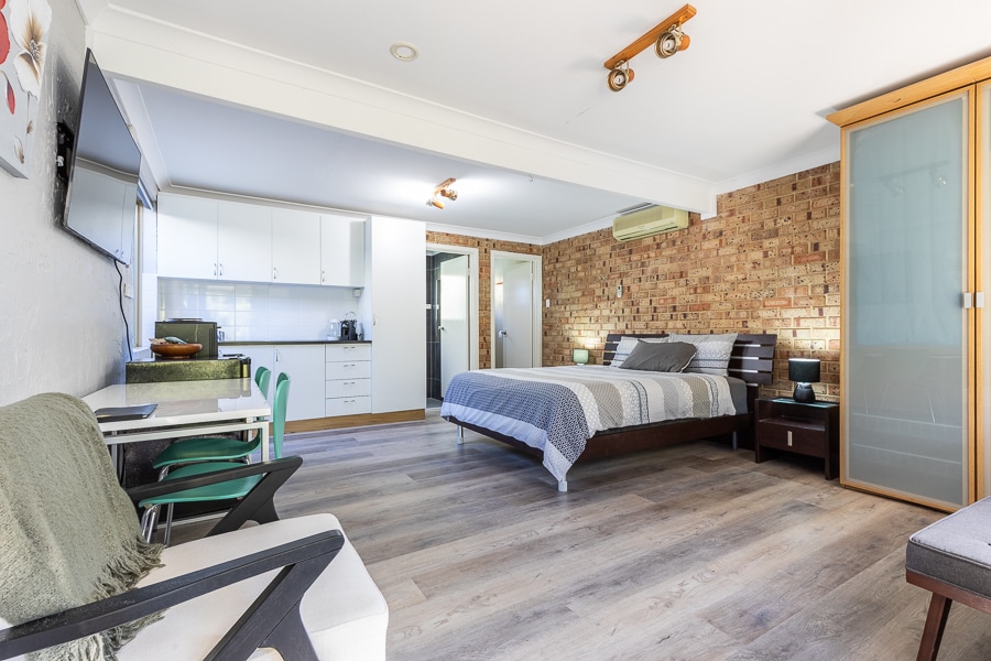 You will have your own place to stay in Scarborough. The Guest house is in a separate building adjacent to the main house, overlooks the property garden and swimming pool. It has everything you need for a comfortable stay – Queen size bed, bathroom with shower, sofa, dining table and fully equipped kitchen. The location is in Scarborough near a big park, within a walking distance to the beach (approx. 900m), café strip and bus stop (approx 500m).