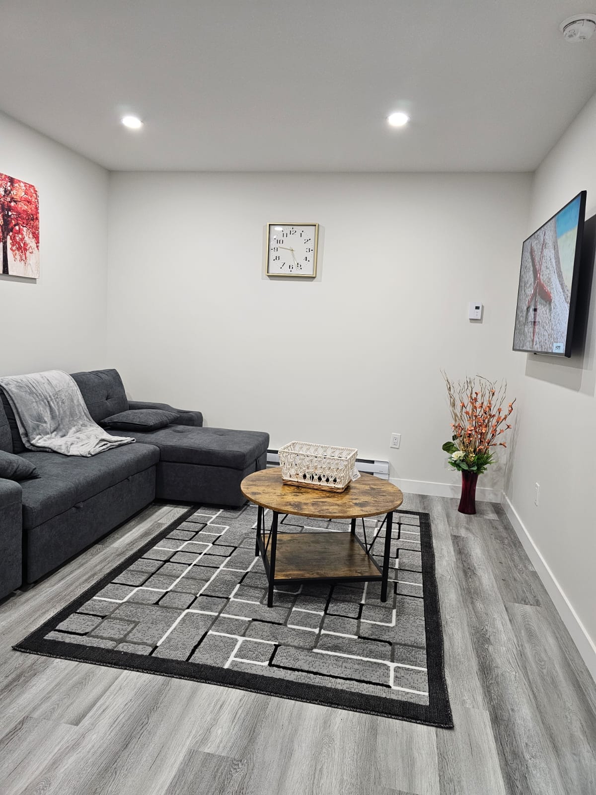 A newly built, cozy and peaceful basement suite designed for comfort and relaxation. Enjoy a spacious living area with a smart TV, a fully equipped kitchen for quick meals, a serene bedroom with a queen-size bed, and a full private bathroom. A dedicated workstation is also provided for reading, remote work, or planning your next adventure. Guest Access This suite has a private access via a secure wall-mounted key box. Entry code will be sent to our guest. Registration Details LCSTA20253933