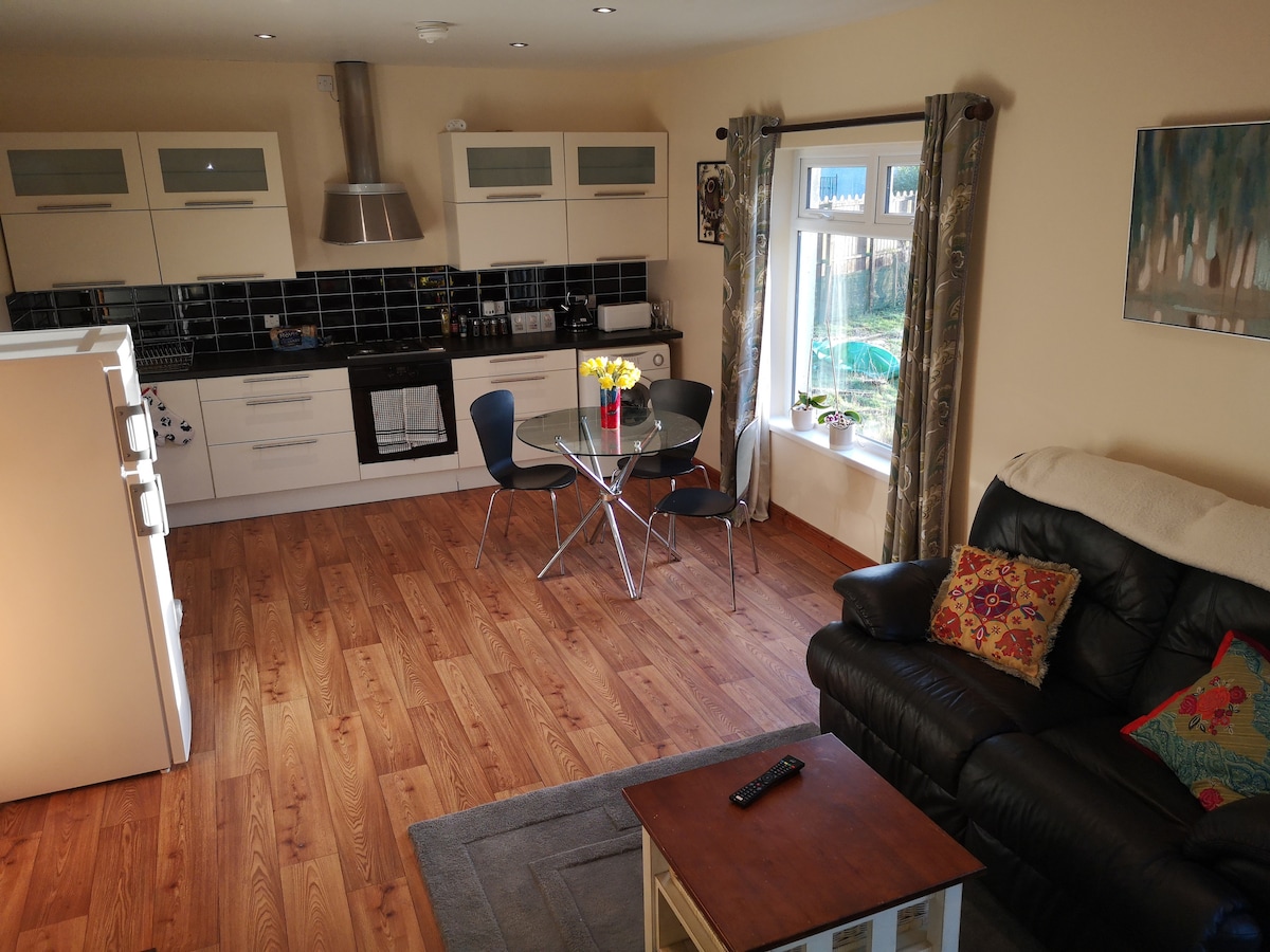 Acogedora cabaña tradicional irlandesa de dos dormitorios. Dormitorios a los que se accede desde la sala de estar con su cocina estilo granja. Dormitorio principal: vestidor y acogedora cama king. Dormitorio dos: 2 camas dobles, una habitación muy espaciosa y luminosa con 2 ventanas con vistas al jardín. La cocina es tradicional y tiene todas las comodidades y comedor para 6 personas. El baño está en la parte trasera de la cabaña y tiene una ducha eléctrica sobre la bañera. El jardín al aire libre y la plaza de estacionamiento están frente a la casa.