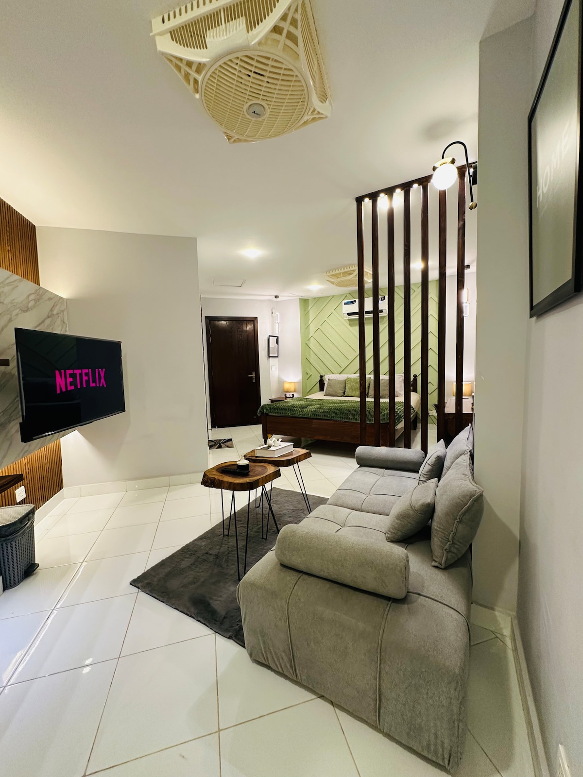 A modern studio apartment in Bahria Town Karachi with a private balcony, one bedroom area, one bathroom, and a fully equipped kitchen. Guests enjoy air conditioning, hot water, fresh towels, and all utilities included. The building offers 4 passenger and 4 cargo elevators, 24/7 security and reception, free parking, and on-site grocery and dining. Perfect for families, solo travelers, and small groups seeking comfort and convenience.