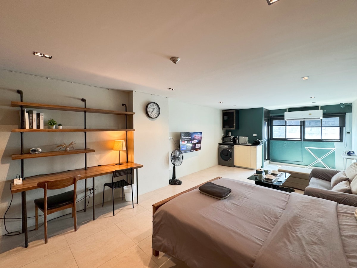 Un espacioso apartamento entero con baño privado, zona de cocina, sala de estar/comedor, 1 dormitorio con área de trabajo designada y balcón. Disfruta de las amplias ventanas para disfrutar de vistas ininterrumpidas y mucha luz solar, aumentando la amplitud para una estancia más relajante. Disfrutá de todas las comodidades de la vida urbana, como las siguientes: - A 2 minutos de MRT Samyan - A 5 minutos de BTS Silom, MRT Sala Daeng - A 5 minutos de Samyan Mitrtown, Chula U. Silom Complex, Thaniya, Patpong, 7-11 - Mucha comida, café y taxis/bicicletas.