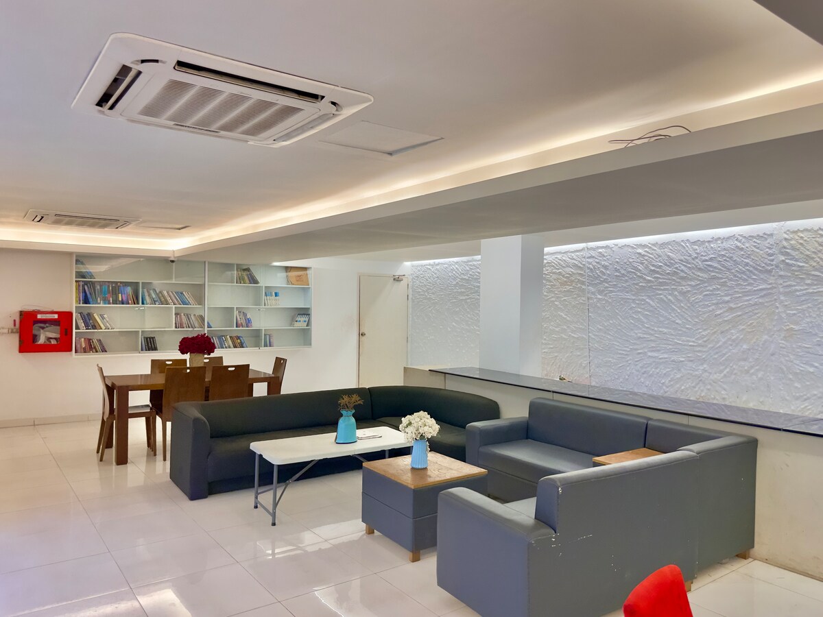 Te damos la bienvenida a nuestro departamento tipo estudio de 500 pies cuadrados. ✦ Nuestro edificio cuenta con muchos servicios: * Piscina * Sala multiusos con escenario * Cine (50 asientos) * Sala de oraciones * Gimnasio totalmente equipado * Baño de vapor * Estación de barbacoa en la azotea * Pista para correr y jardines en la azotea con asientos. * Sala de estar * Seguridad las 24 horas, 7 días a la ✦ También ofrecemos servicios: * Limpieza de habitaciones y baños * Servicios de lavandería * Recogida de basura * Comida (se proporcionará el menú) * Traslado y recogida en el aeropuerto ¡Que tengas una buena estancia!