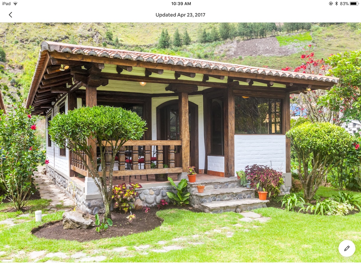 Es una casa cabaña, ubicada a 7 minutos del centro de Baños ,lleno de áreas verdes y jardines ,orquídeas y diversidad de aves , rodeada de montañas y una vista impresionante a la cuenca del rio Pastaza , única para el descanso y el relax familiar. Adicional para su conocimiento necesitan subir 38 escalones de cemento y piedra rústica , al final tendrán la recompensa de la magnífica vista al río Pastaza desde lo alto y su recién inaugurada hidropiscina de agua temperada.