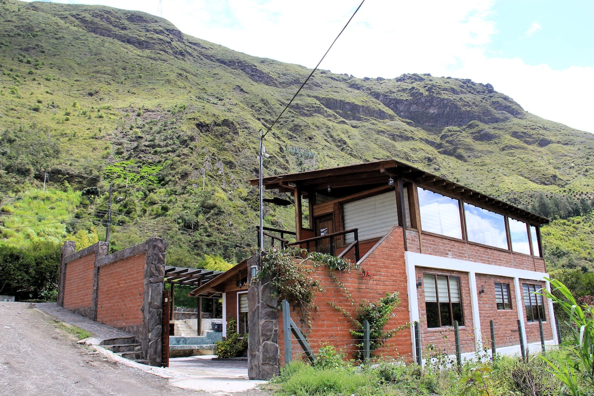 Es una casa cabaña, ubicada a 7 minutos del centro de Baños ,lleno de áreas verdes y jardines ,orquídeas y diversidad de aves , rodeada de montañas y una vista impresionante a la cuenca del rio Pastaza , única para el descanso y el relax familiar. Adicional para su conocimiento necesitan subir 38 escalones de cemento y piedra rústica , al final tendrán la recompensa de la magnífica vista al río Pastaza desde lo alto y su recién inaugurada hidropiscina de agua temperada.