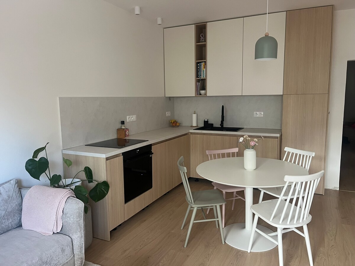 Departamento moderno en Trenčín: ¡comodidad, privacidad y excelente ubicación! Disfruta de tu estancia a solo 1 km del centro de Trenčín, cuya parte principal comienza en la plaza Mierov directamente debajo del icónico castillo de Trenčín. Adecuado para 2 adultos y 1 a 2 niños. ✔ 2 habitaciones (1 dormitorio con una cama doble grande y 1 sala de estar con sofá cama y una gran cocina premium con electrodomésticos incorporados, 1 baño superior grande con inodoro Estacionamiento privado reservado GRATUITO justo en la entrada.