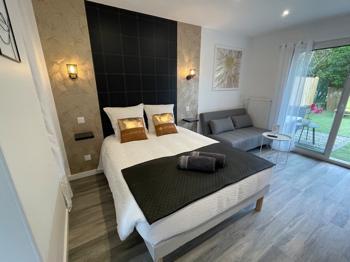 Estudio independiente nuevo con aseo separado, cuarto de ducha, pequeña cocina equipada, cama doble, sofá cama para 1 o 2 niños solamente, y jardín privado con muebles de exterior, sofá, tumbonas y mesa con sillas. Aparcamiento privado gratuito , entrada del estudio y en la propiedad cerrada con puerta motorizada con código digital. Llegada y acceso libre con código digital para el portal y caja de llaves segura para el alojamiento. Tranquilo, cerca del centro de Chambéry.