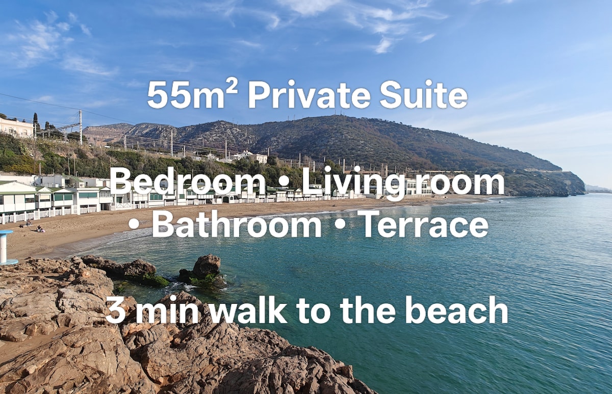 ¡45 m² de uso exclusivo, perfectos para teletrabajar, disfrutar de la playa, hacer trekking o visitar Barcelona! Alojamiento amplio y luminoso, con vistas a la montaña y al mar al fondo. A solo 3 minutos a pie de dos preciosas playas, en el encantador pueblo mediterráneo de Garraf. 📍 Ubicación: • Playa a 3 min a pie • Estación tren a 5 min a pie • Barcelona a 30 min en tren • Sitges a 7 min en tren • Aeropuerto a 15 min en coche • Rutas de trekking ☀️ ¡Sol el 75 % del año!!