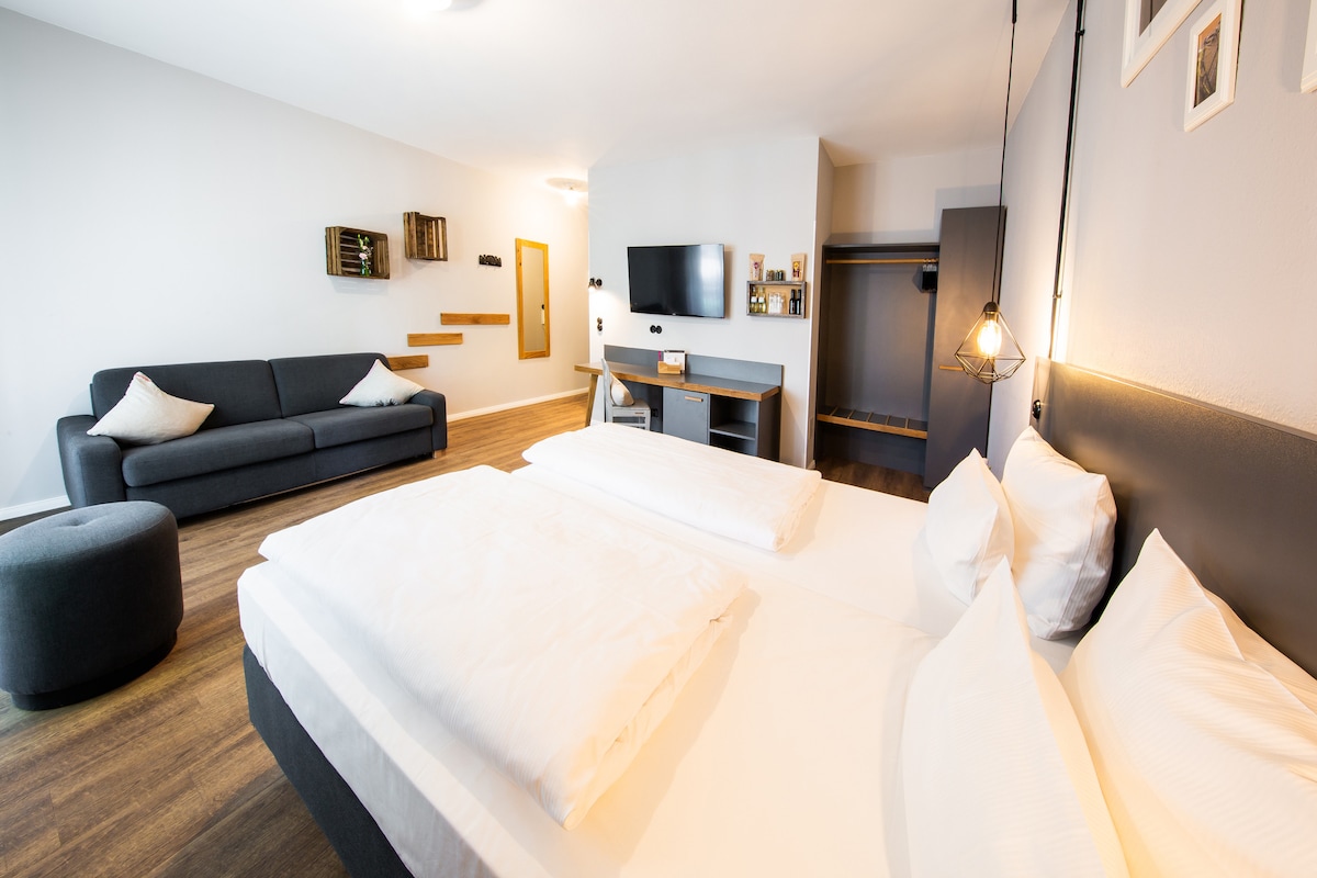Enjoy the perfect blend of comfort and functionality in our thoughtfully appointed room, ideal for both short visits and extended stays. With 22–24 m² of living space, this room features a combined living, working, and sleeping area, making it especially well-suited for any traveler. You'll sleep soundly in a comfortable double bed, and the dedicated work area provides the ideal setup for productive days. The room also includes a cozy seating area with an armchair