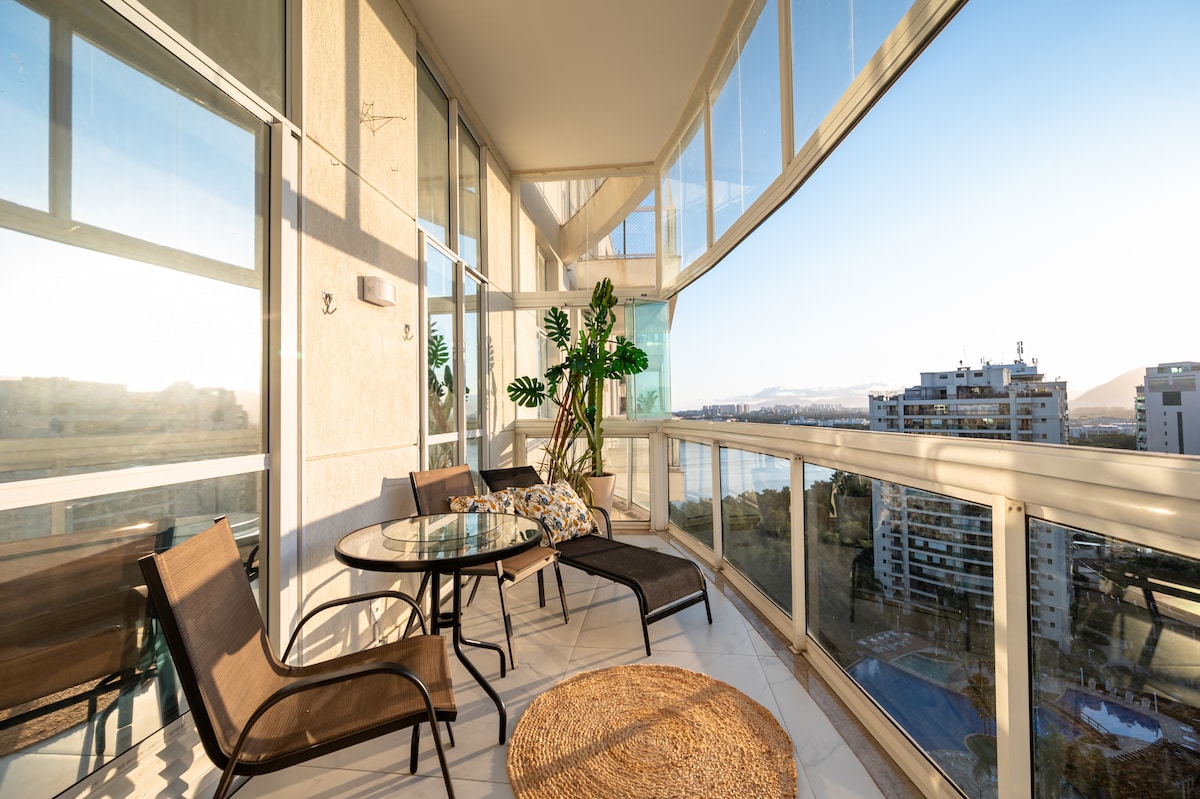 Delicioso lugar con mucha vegetación, balcón con vista, hamaca y sol de la mañana, sala de estar integrada (sofá cama, TV, split), dormitorio con cama queen, armario y caja fuerte. Pileta climatizada, restaurante y estacionamiento en el edificio. 📍 Ubicación perfecta: zona tranquila, cerca de mercados, centros comerciales y playas de Barra. ¡Fácil acceso en auto, metro, BRT, Uber, taxi acuático o bicicleta! Descubrí por qué Tim Maia inmortalizó la frase: 🎶 “¡De Leme a Pontal, no hay nada igual!”