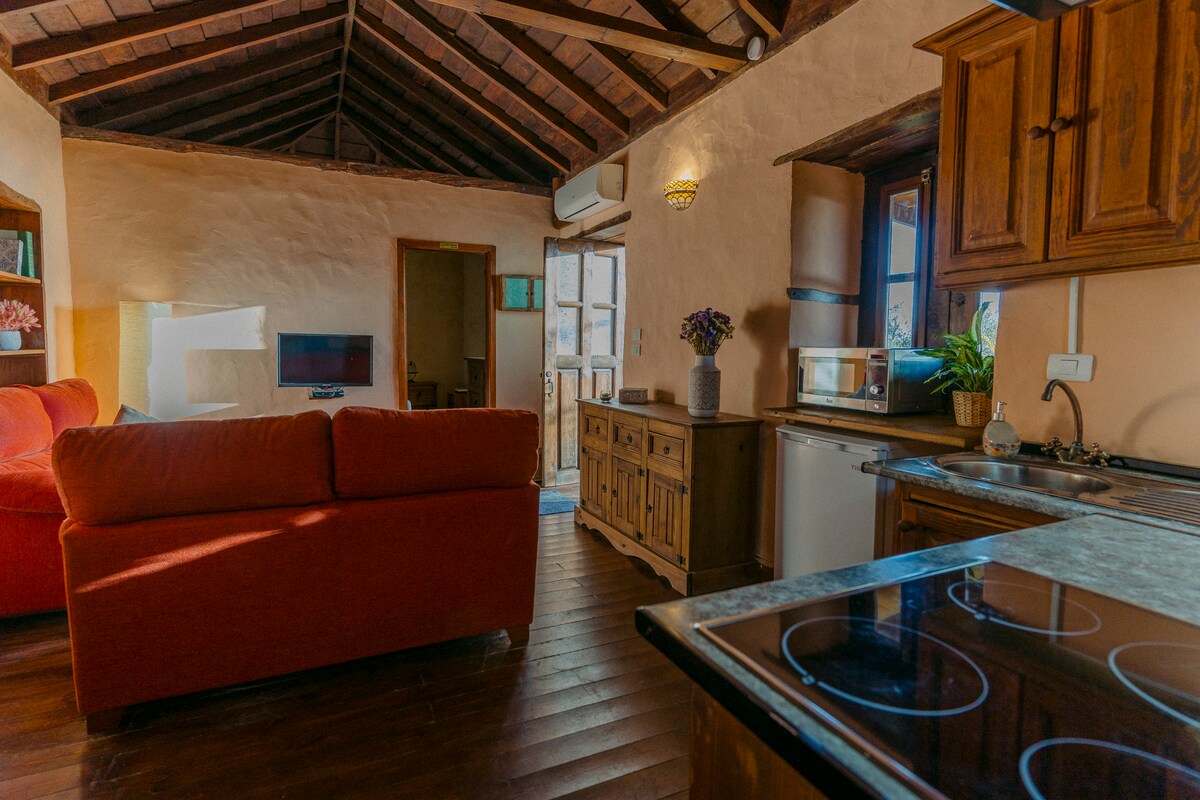 Casa de vacaciones independiente en la finca de 7,5 ha Hacienda La Palma. Tranquilidad y aislamiento absolutos con un microclima único. En medio del viñedo, La Placita ofrece un acogedor refugio para 2 personas. Disfrute de sus mejores días con unas vistas increíbles del interminable océano Atlántico y un cielo con fantásticas formaciones nubosas, que se convierte en un claro cielo estrellado tras una resplandeciente puesta de sol roja por la noche.
