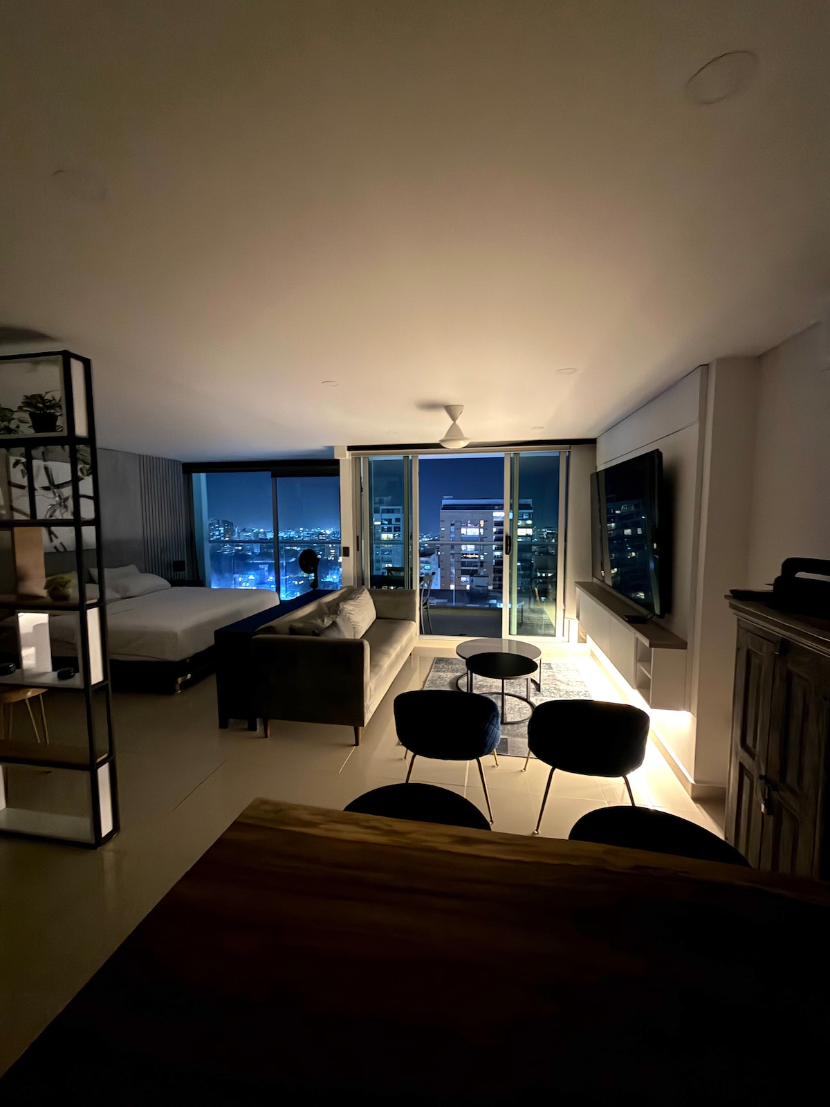 ¡Tu estancia perfecta para vacaciones o negocios! Disfruta de este hermoso estudio con Smart TV y espacio de trabajo, ideal para relajarte o trabajar cómodamente. Ubicado a solo 5 minutos de centros comerciales, restaurantes, bancos y transporte, en un edificio con: ✅ Lobby tipo hotel y parqueadero ✅ Coworking, gimnasio y sala de juegos ✅ Terraza con mirador, jacuzzi y seguridad 24/7 Además, disfruta de nuestro mini bar por un costo adicional. ¡Reserva ahora!