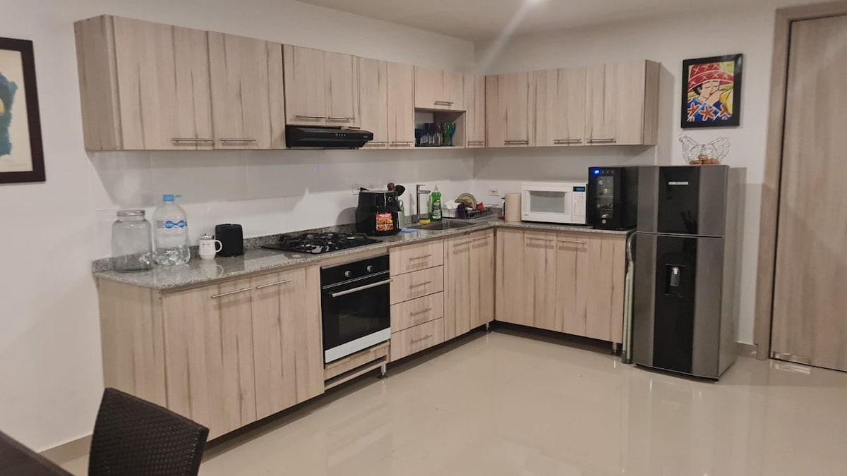 Es un apartamento, completamente independiente y exclusivo para el huésped, con 2 habitaciones, dos camas dobles, un sofacama, 2 baños, aire acondicionado, cocina completa y equipada, barra desayunadora, área de labores con lavadero manual y lavadora automática, nevera, Internet, Televisor smart, Tv cable, Netflix, Disney+, limpieza semanal gratuita para estancias largas si lo solicita.