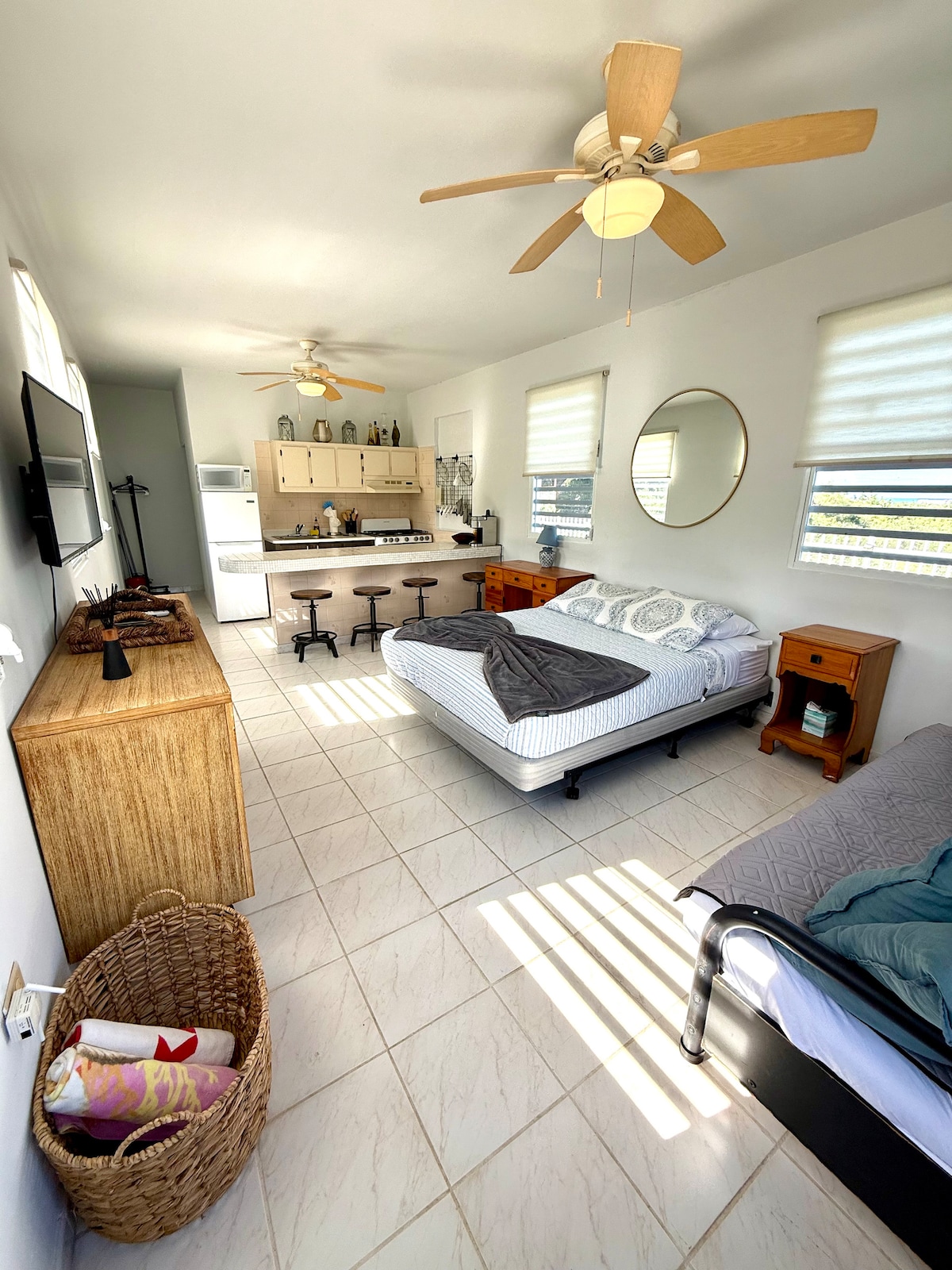 Disfruta de este espacioso estudio con tu propia entrada/estructura en un vecindario residencial local cerca del hotel Horned Dorset Primavera. Este espacio es perfecto para parejas, aventureros solitarios o tranquilos. El balcón tiene una hermosa vista (parcial) al atardecer al mar. Incluye energía de respaldo completa y agua. Date un chapuzón en el océano Caribe, donde la playa es prácticamente privada y se puede acceder directamente al otro lado de la tranquila calle. Cerca hay muchas playas hermosas.