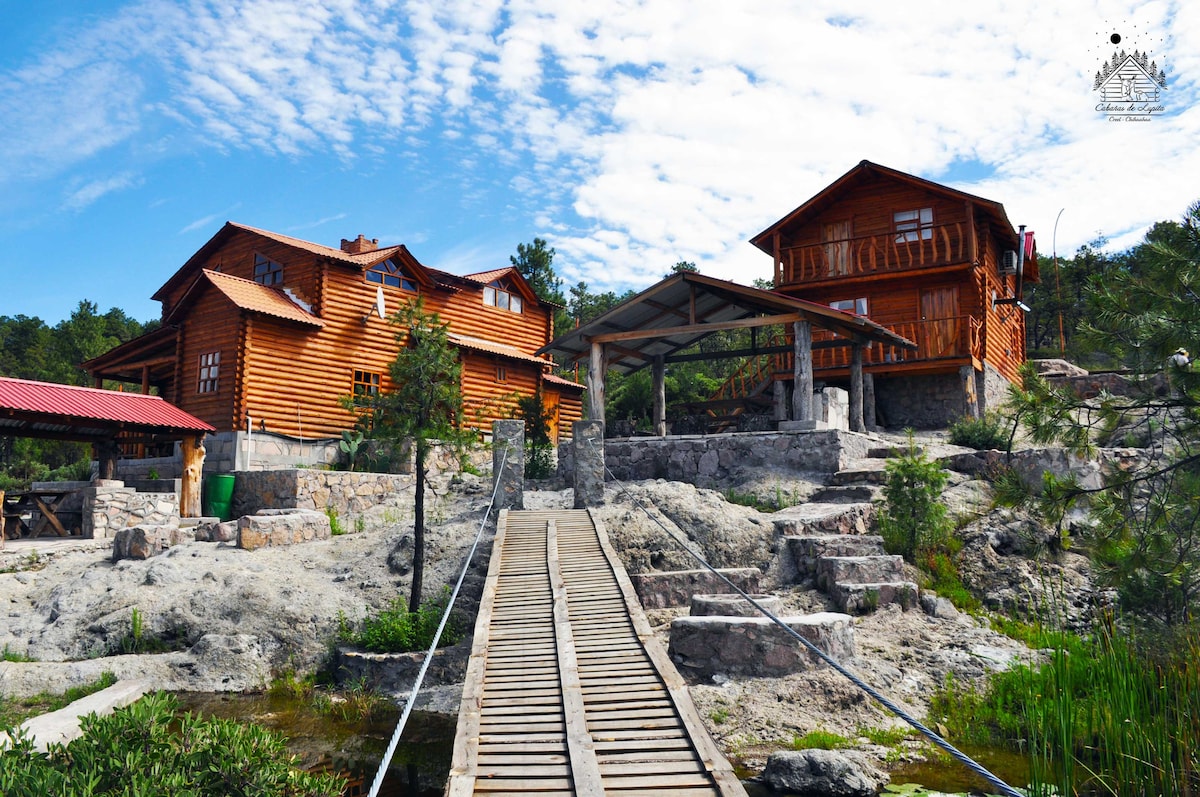 Ubicadas en la cima de una montaña, nuestras cabañas rústicas de madera ofrecen un ambiente 100% familiar. Rodeadas por la exuberante naturaleza de la sierra y con vistas panorámicas al pintoresco pueblo de Creel, explora un paraíso de serenidad y aventuras. Experimenta la vida en el campo, pasea por nuestra granja y encuentra venados, patos, gallinas, conejos y más. Comparte momentos alrededor de fogateros y asadores, con leña incluida.