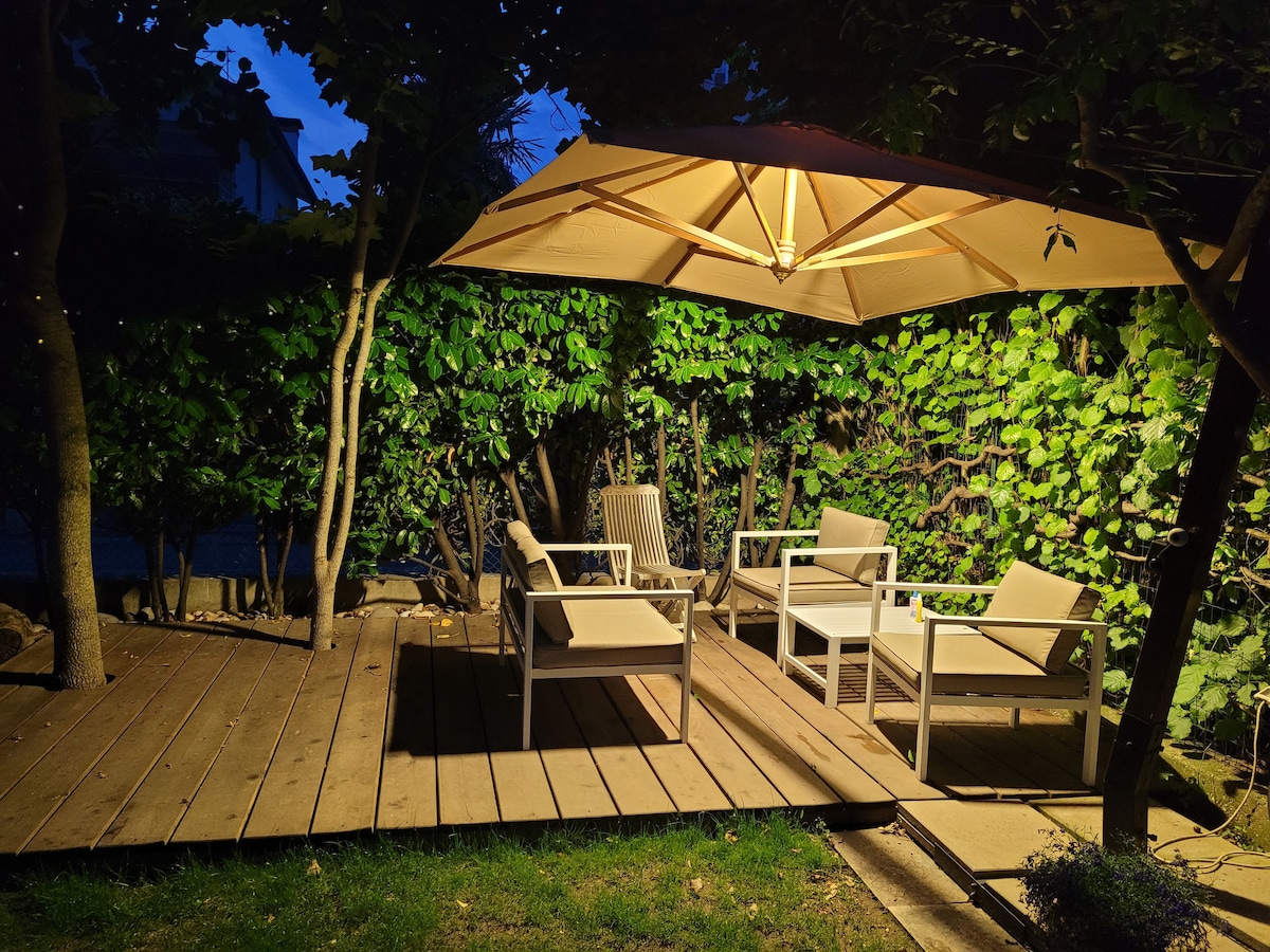 Rilassati e ricaricati in quest'oasi di quiete ed eleganza. Non è raro vedere scoiattoli in giardino. Monolocale completo di grande cucina completamente attrezzata. Tavolo frattino, tv schermo piatto da 43 pollici, camera matrimoniale e divano letto matrimoniale, libreria, bagno privato, riscaldamento a pavimento, opere d'arte contemmporanea alle pareti. Patio esterno molto ampio con ombrellone, sdrai, tavolo e poltroncine. Wi-fi gratuito, aria condizionata. Park auto nella proprietà.