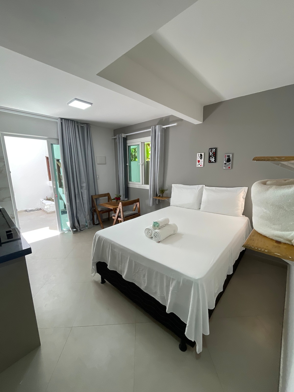 Bem-vindos! ALÉM DOS SONHOS IV é um conjugado cosy no 1ºandar com cozinha e 1 cama de casal, ar-condicionado, banheiro privativo. Localização excelente e silenciosa. 30mts da Praça Principal e 5min da 1a praia. Perto da Natureza Fornecemos enxoval completo de cama e banho e cuidamos da sua reserva do começo ao fim. *possível adicionar café da manhã à parte *temos parcerias com agencias locais para passeios e traslados *NOVO: Colocamos SMART TV :)
