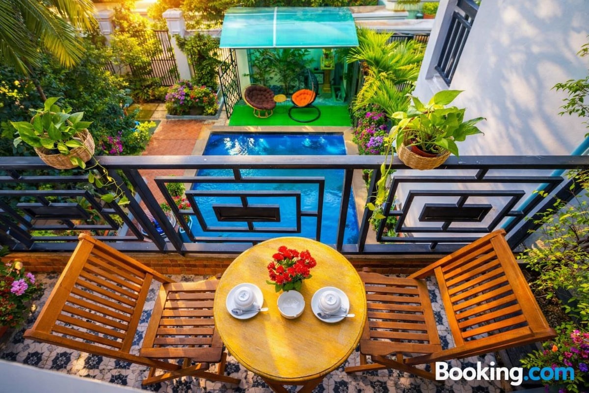 Our beautiful Landmark Villa has one double bed room and one twin bed room, 4Ac, cable smart TV, Wifi, hot water for the whole house for four showers and sinks, good for 5 people, three bathrooms, two open air shower, roof view terrace, private swimming pool that can view from all angles of the house, beautiful kitchen with automatic ice maker fridge, automatic cool water dispenser, is designed for your comfort, 20 minute from airport, 15 minutes from old market and Pub Street by Tuktuk.