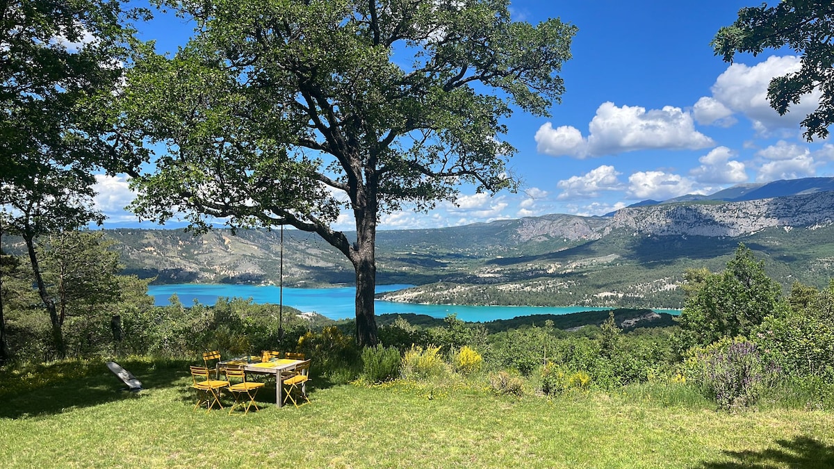 Pequeña cabaña en el bosque encaramada en los árboles, con todas las comodidades, para dos personas, sin vecinos, en una propiedad de 13 hectáreas cerca del Gran Cañón del Verdon a unos 1,5 km del pueblo. Una hermosa terraza grande, la naturaleza, los pájaros, la paz. La cama lista a la llegada , toallas. En el pueblo todas las comodidades . Actividades, escalada, barranquismo, senderismo, baño en el lago Sainte Croix. Gastos de limpieza incluidos. El desayuno no está incluido.