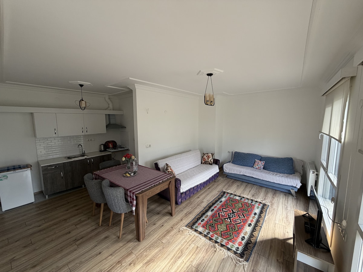 Disfruta de una estancia sencilla y acogedora en este lugar céntrico y tranquilo. (LA HABITACIÓN THİS TIENE AIRE ACONDICIONADO) La habitación tiene una cama doble y 2 camas individuales con sábanas limpias. Hay una zona de estar. Ahí tienes una tetera, algunos tipos diferentes de té y una botella de agua... La habitación tiene un techo muy alto que hace que la calidad de tu sueño sea mucho mejor. El desayuno orgánico casero es de 150 TL adicionales; conexión a internet wifi gratuita; toallas; ... puedes usar la cocina si lo deseas.