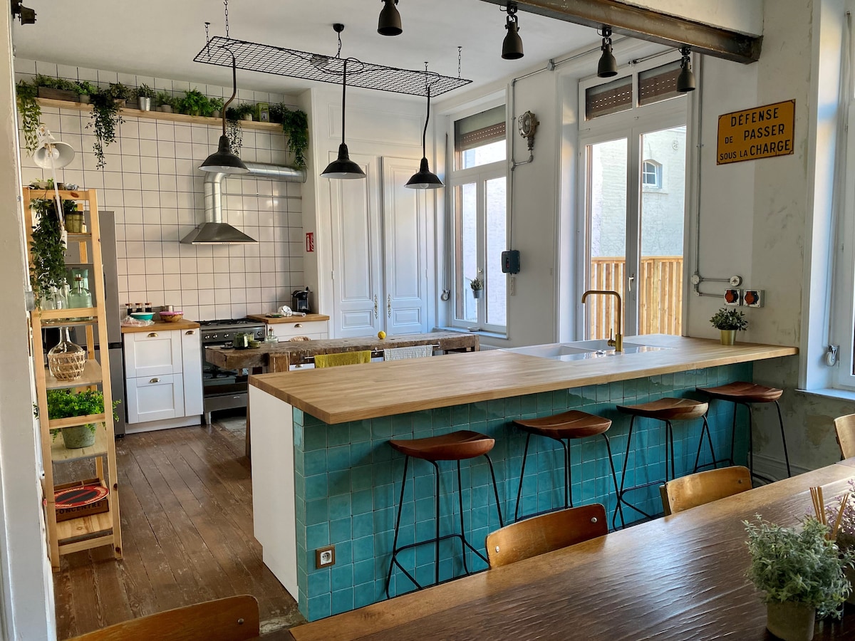 Situé dans le centre de Dunkerque (500m de la place Jean-Bart), ce vaste appartement au style bohème chic / industriel est l'unique habitation d'un immeuble de caractère (ancienne brasserie dunkerquoise). Doté d'une terrasse panoramique de plus de 70 mètres carrés, six chambres (dont deux avec sdb et WC intégrés), deux salles de bains, il se situe à 10 min à vélo de la plage, 15 min à pied de la gare, 5 min à pied de la place Jean Bart.