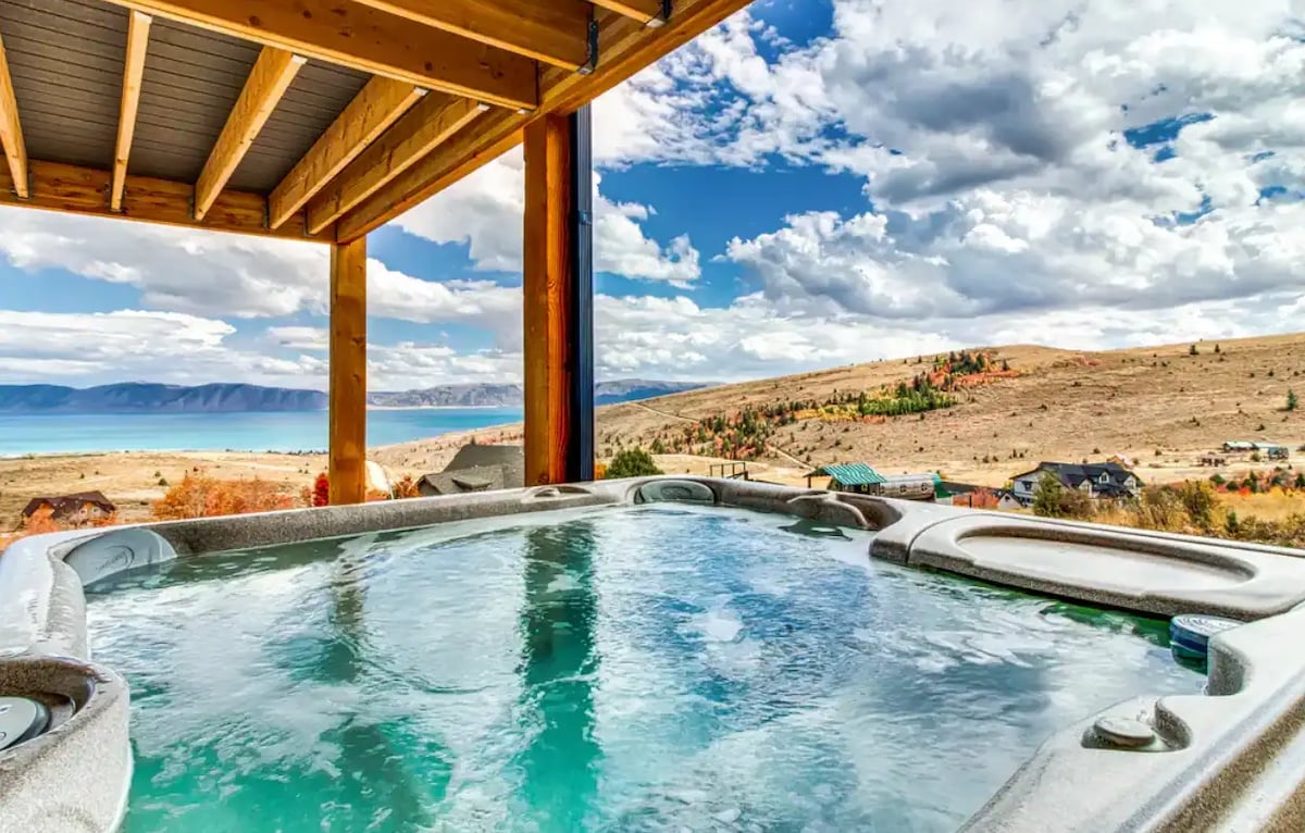 Large 7 Bedroom 6,700 Sq ft vacation rental tucked away in the gorgeous Wasatch Mountains of Northeastern Utah; this stunning home overlooks the blue beauty of Bear Lake. Serene, scenic, and quiet, this area is the perfect place to relax and get away from it all. You'll love the private hot tub on backyard patio, and guests will even have access to the clubhouse (located behind the home) with an outdoor pool and spa (Seasonal from Memorial Weekend to Labor Day)!