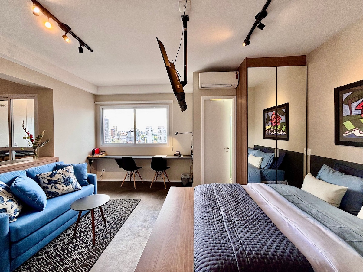 Estudio boutique con una de las vistas más bonitas de la ciudad de São Paulo. A 2 minutos a pie del metro. Cocina totalmente equipada con nevera escondida por una puerta de madera. Wifi, aire acondicionado y TV inteligente de 55 pulgadas. Registro autónomo con cerradura electrónica inteligente. Juega al tenis o ve al gimnasio y relájate en las piscinas (al aire libre o cubiertas climatizadas) y saunas (húmedas o secas) después. El área común también incluye espacios de coworking y lavandería. Los visitantes deben estar previamente registrados en la recepción.