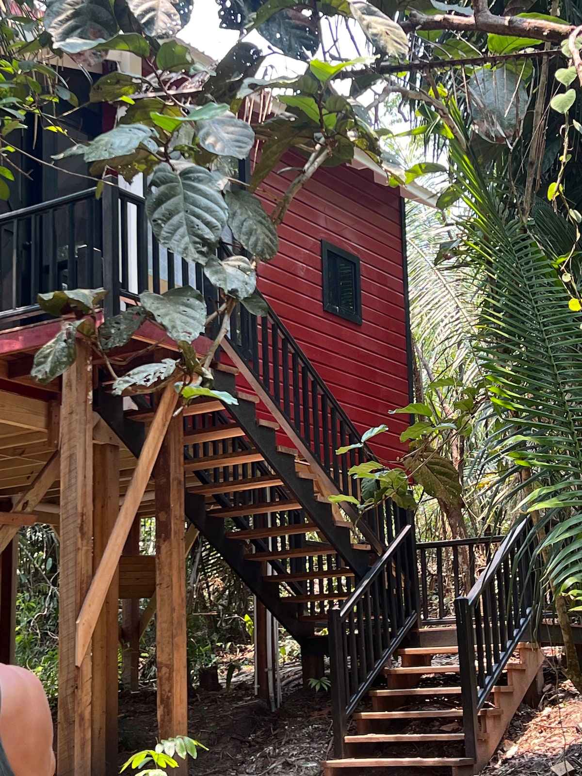 Our latest Tree House Gumbo Limbo leaves nothing to desire. It has one bedroom with a king-size bed, ceiling fans and an AC. The floor to ceiling windows surrounding the bed give you the chance to wake up in the middle of the canopies of the trees. It features a modern outdoor shower bath with a big rain shower head. The kitchen area has a fridge, microwave and a coffee maker. Enjoy the big veranda and listen to the birds and howler monkeys from your hammock or watch the starry sky at night.