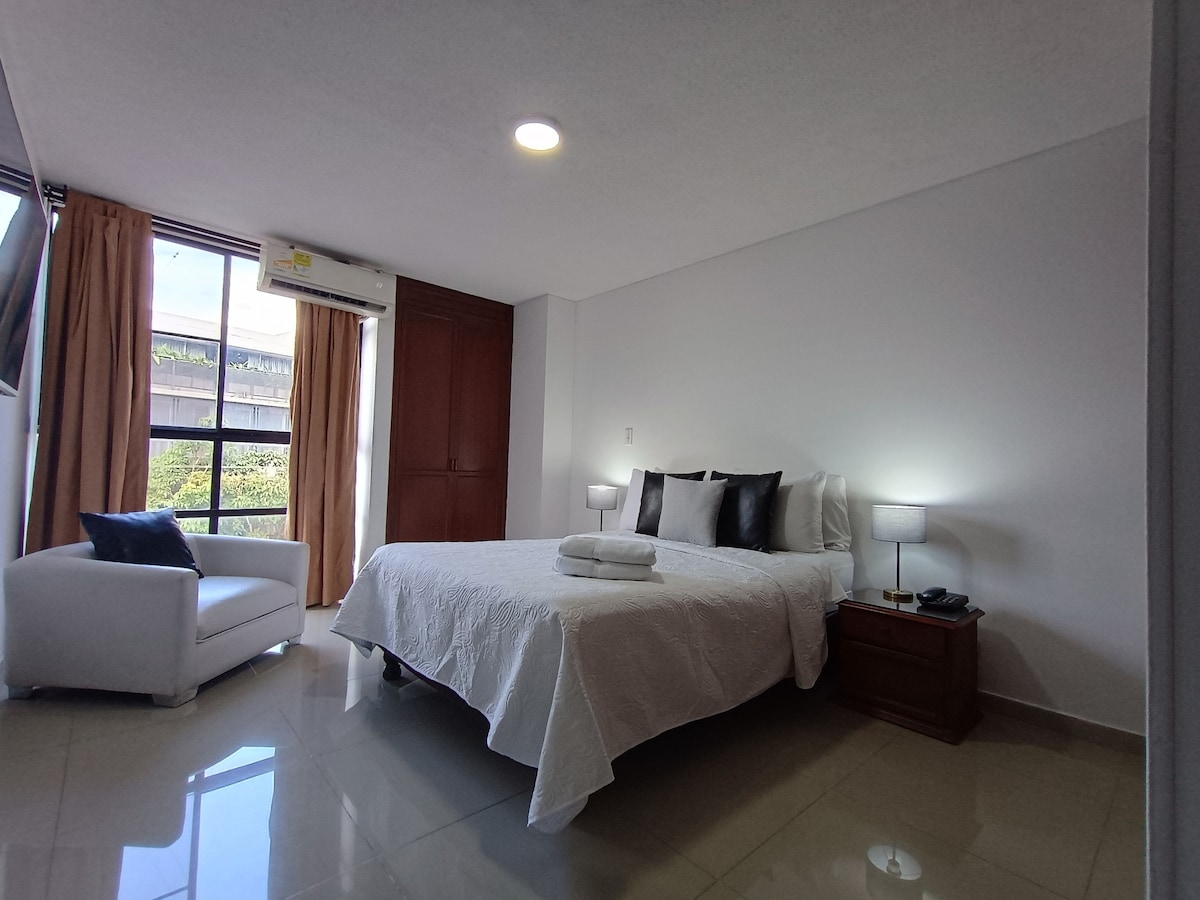 Edificio Granada 17.22 Disfruta Cali en este apto de 63 mt2 en Granada, la mejor Zona Rosa. Diseño moderno y lujoso que ofrece acceso 100% autónomo garantizando tu privacidad y seguridad. COMODIDADES: +Cocina equipada +WiFi fibra optica +Escritorio +A/C + Smart TV +Cama queen +Agua caliente +2 Baños +Sofa cama Ideal para parejas, amigos o familia Sumérgete en la vida cultural y gastronómica, bares y tiendas a la mano. A tan solo minutos del Boulevard del Río y La Iglesia Ermita.