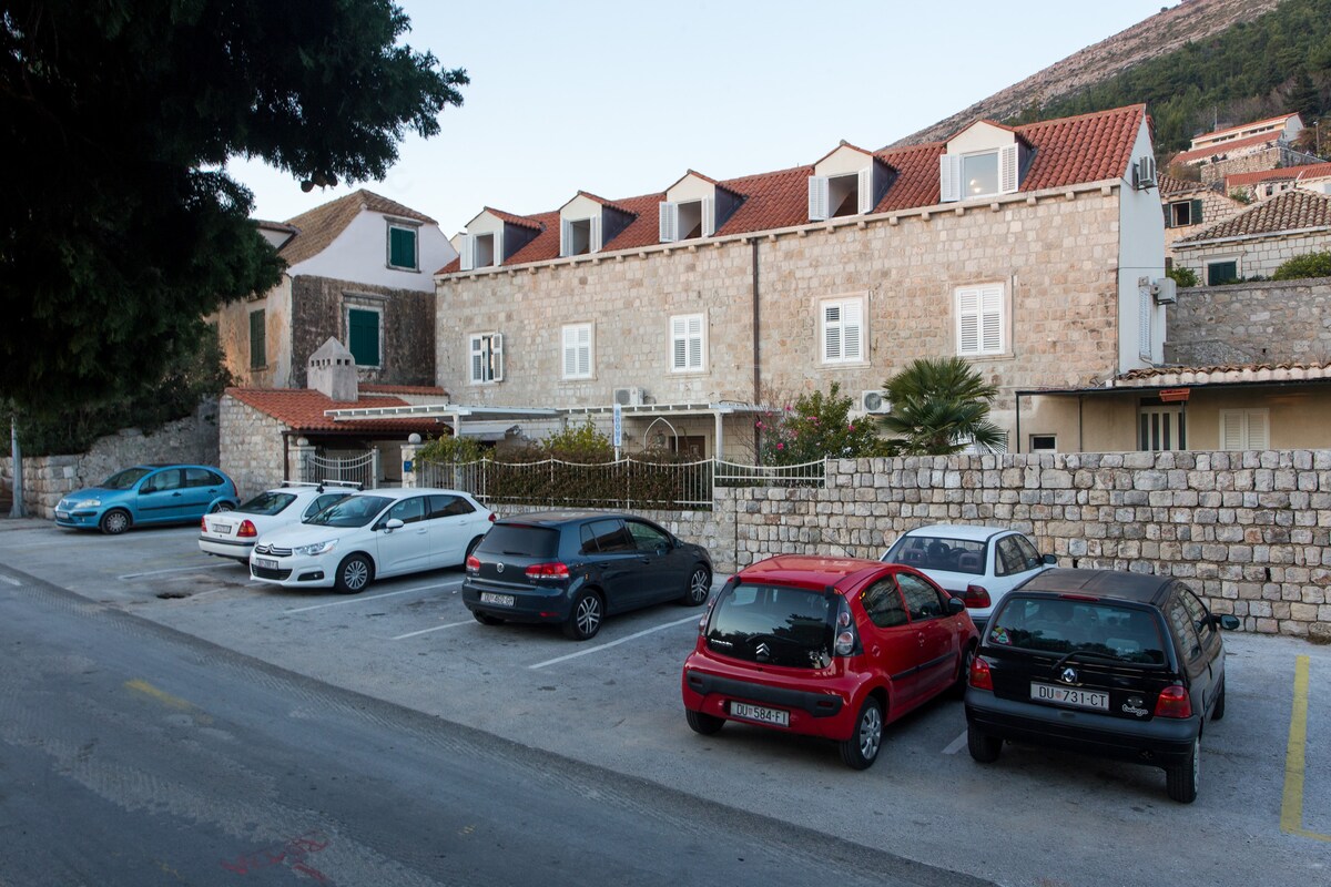 Nuestro departamento es un acogedor monoambiente de 25 metros cuadrados (237 pies cuadrados). El apartamento tiene 1 dormitorio con 1 cama doble que en realidad son dos camas individuales, una justo al lado de la otra. Cocina pequeña (2 placas calefactoras) con mesa de comedor. Baño con ducha/privado/WC. Terraza PRIVADA muy grande (100 metros cuadrados o 1075 pies cuadrados) reservada solo para ti, que ofrece vistas espectaculares del mar, el casco antiguo, la isla de Lokrum. Para los huéspedes que llegan con auto, el estacionamiento se incluye de forma gratuita en nuestro lugar de estacionamiento privado.