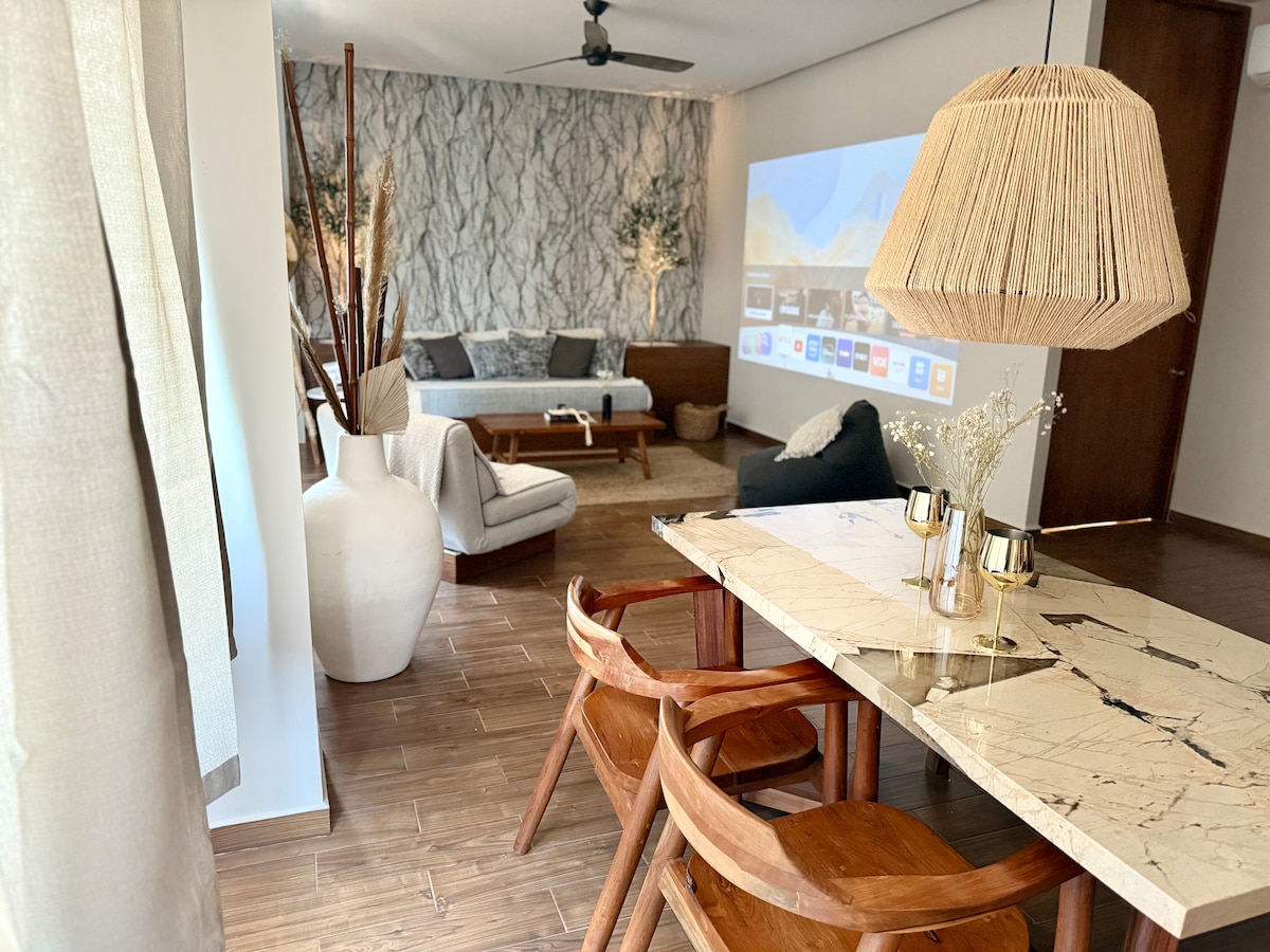 Departamento amplio y seguro. Una recámara con cama king , colchón memory foam de alta calidad, armario embutido, y baño privado. Cocina semi completa , muy equipada, refrigerador de 14 piés. Sala de estar con comedor en mármol , sofá/ cama , sillón flex , proyector de pantalla estilo “cinema en casa “. Medio baño Edifício con - Elevador - Estacionamiento - Vigilancia24 horas Amenidades: shampú, acondic. jabón de baño , jabón de mano. toallas de papel, funda de edredón, 4 almohadas.