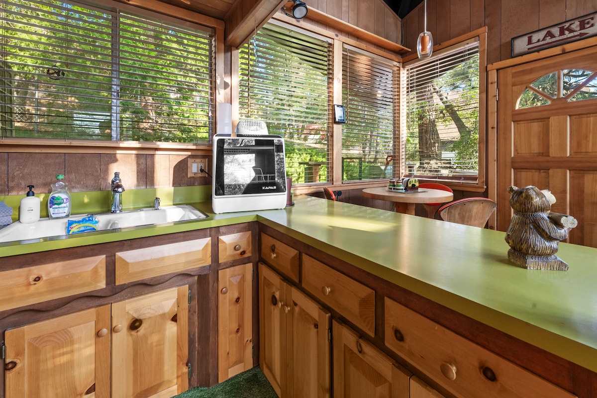 . Walking distance to the Big Bear Mountain Resort . Stunning sunsets from the deck . Pets welcome . Fully Equipped Kitchen w/high end Smeg + Hallman Appliances . A-Frame + Open Concept Lounge/Dining/Kitchen . Large Furnished Main Deck w/ Stunning Lake +Forest Views . Movie Room w/high-resolution projector . BBQ/Grill . Hiking Trails right outside our doorstep . High-speed Wi-Fi + Workspace . Central Heating + Fireplaces . Hot Tub on a covered deck offering privacy + scenic views year-round!