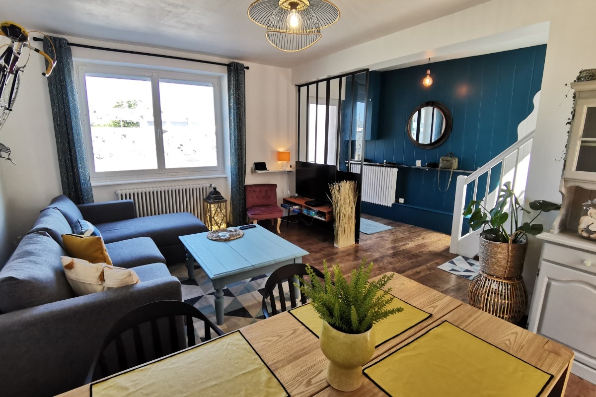 Maison de charme de 90m2 avec patio de 20m2 disposant de 2 chambres, 4 couchages. Située à 3mn à pied du centre ville , ce logement très lumineux, décoré avec soin et une touche d' originalité est très bien équipé. 1 pièce dédiée pour télétravailler équipé Fibre. Commerces; tout peut se faire à pied! Parking gratuit. draps, serviettes de toilettes fournis. Les lits sont faits. Rivière et GR34 à 2 pas. Plage de Loctudy et l’Ile Tudy à 15 min en voiture. La Torche à 15mn Point du Raz à 40 m.