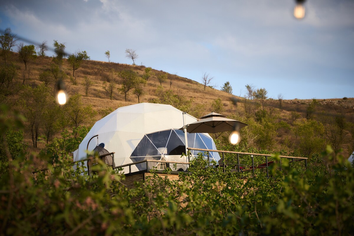 Disfrutá de un glamping de lujo con tu propio jacuzzi privado y una amplia terraza con vista a las montañas Ala-Too y al horizonte de Bishkek. Ubicada en un tranquilo jardín de pistachos, nuestra cúpula de diseño ecológico ofrece calefacción por suelo radiante, aire acondicionado y un baño completo con comodidades de primera calidad. Disfrutá de sábanas frescas, toallas suaves, café y té de cortesía y servicio de recepción las 24 horas, los 7 días de la semana. Perfecto para parejas que buscan romance o huéspedes que buscan un refugio de 5 estrellas rodeado de naturaleza.