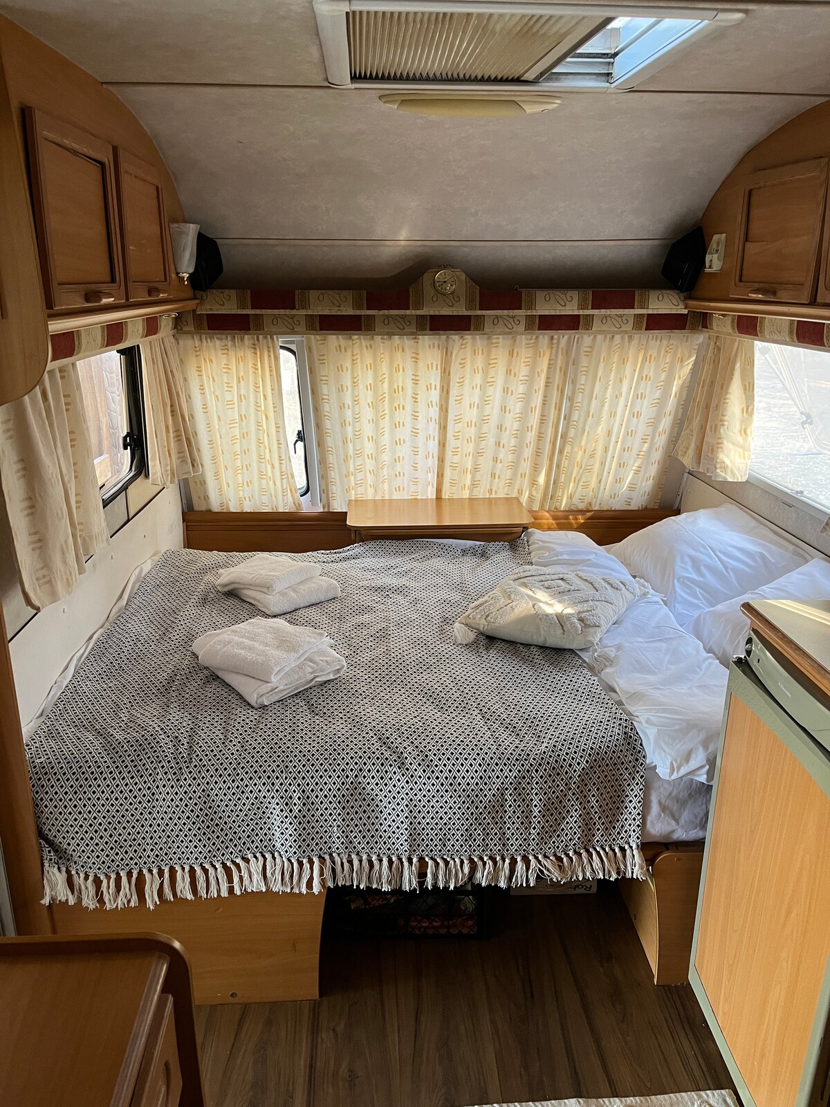 Redescubre la naturaleza en este lugar inolvidable. Puedes tomar café directamente junto al mar con una vista increíble desde la comodidad de un pequeño estudio. ¡Tienes todas las comodidades de casa (baño, cama tamaño king, cocina pequeña, electricidad, agua caliente, inodoro, ducha) directamente en medio de la naturaleza, a 30 metros del mar! Tienes una parrilla que puedes usar, mesa y sillas, sombrilla. ¡Prohibido fumar en el interior! ¡¡¡Hogares por tu cuenta!!! ¡Tienes que repostar la caravana con agua y vaciar el tanque del inodoro!