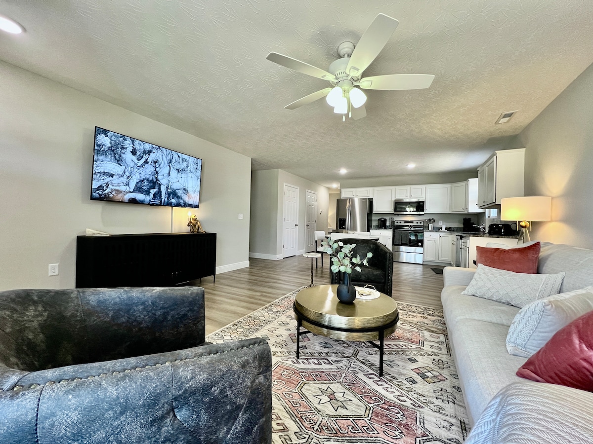 Nuevo para 2024/2025... muebles actualizados con sofá cama de espuma viscoelástica, camas tamaño king y queen de espuma viscoelástica, colchón doble adicional para el piso para opciones adicionales para dormir. ¡Área de conversación al aire libre! Casa de invitados luminosa y espaciosa, ubicada detrás de la casa principal en 3 acres en Lebanon, Ohio. Cerca del centro de Lebanon, Springboro, Waynesville y a poca distancia en auto de Kings Island. -Kings Island a 11 millas. - Parque deportivo del condado de Warren 7 millas. -Roberts Center Wilmington a 20 millas. -Caesar Creek State Park 10 millas