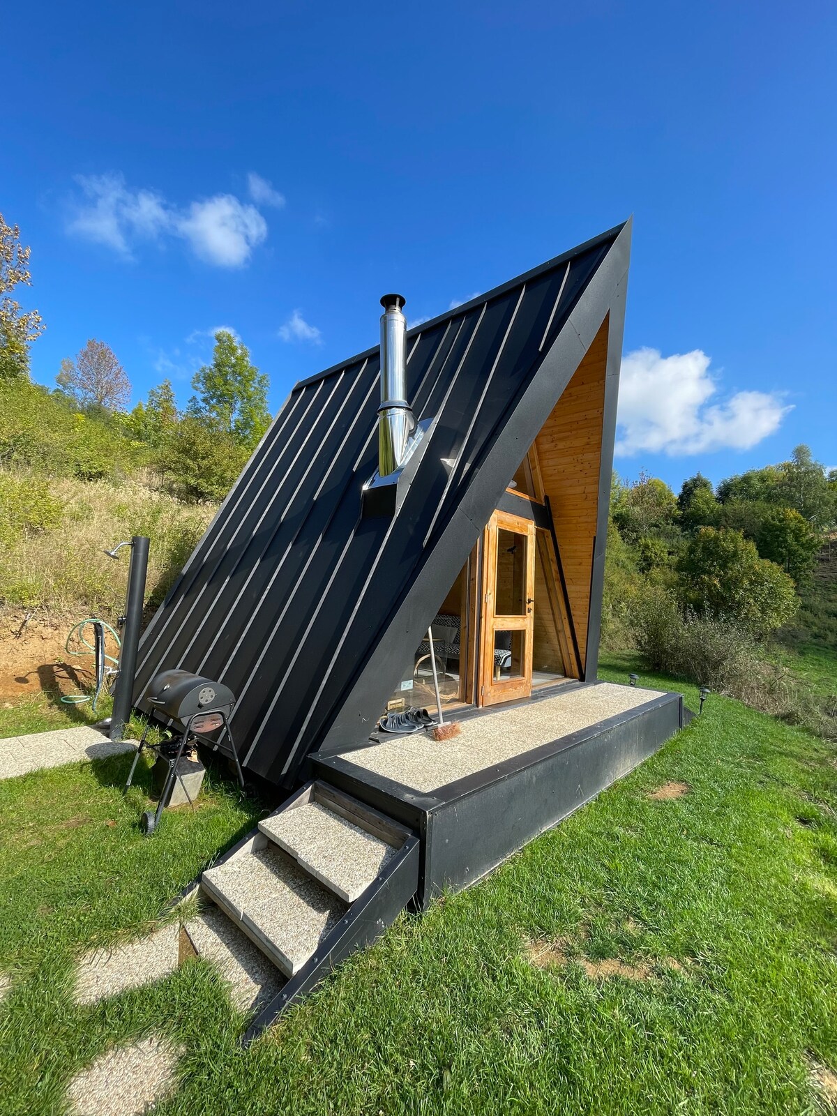 Celoroční luxusní a zateplená áčková chata se zkosenou střechou, celým proskleným čelem s rozměry 4,5×4 metry s terasou a druhým patrem. Nachází se na mýtince s výhledem do korun stromů. Na pozemku najdete venkovní sprchu a fantastickou káď, kterou si můžete napustit jak v létě, tak v zimě. Ubytování je záměrně bez elektřiny, aby si každý užil klid a odpočinek od moderních technologií. Užij si krásné prostředí tohoto romantického místa v srdci přírody.