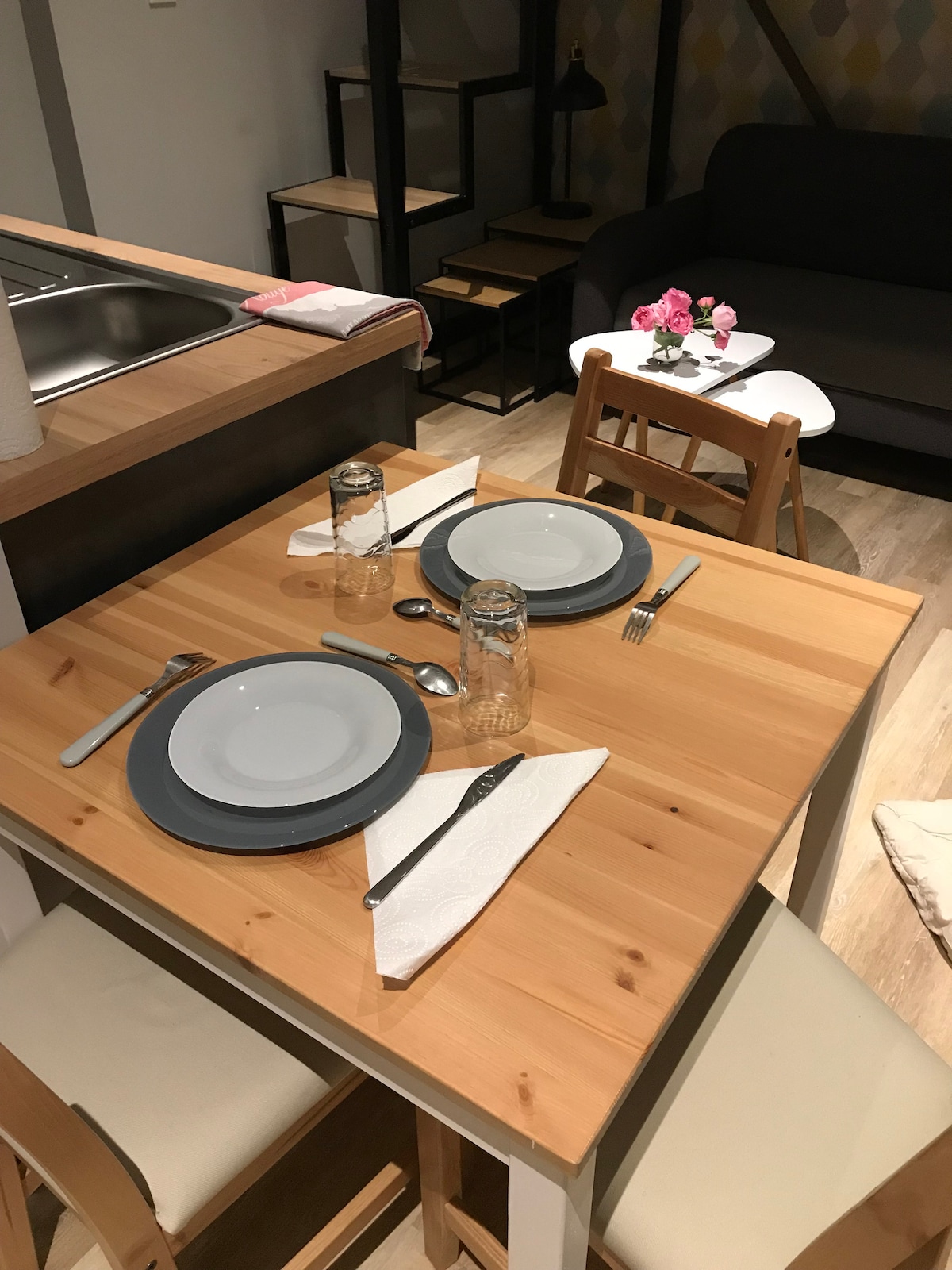 Appartement chaleureux récemment rénové. Il dispose d’une cuisine équipée avec un espace repas, d’une salle de bain avec douche, d’un espace chambre (lit mezzanine 2 places) / séjour avec télévision. Appartement situé à 15/20min du Futuroscope en voiture, à quelques minutes de la gare via la ligne de bus desservant le logement, à quelques minutes du Parc de Blossac, et à 15min du centre ville à pieds.