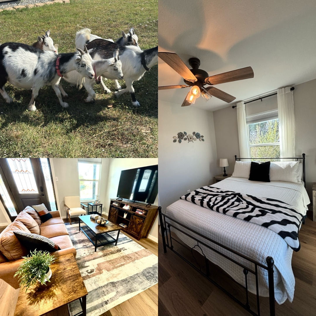 Nuestro pequeño espacio cuenta con entrada remota y tu propio porche para sentarte y disfrutar de la puesta de sol. Aproximadamente 550 pies cuadrados con muchas comodidades. La cama tamaño queen es una cama abatible y se puede plegar para darte más espacio. También hay una cama plegable, todas las sábanas incluidas. Este tipo de cama es mejor para un niño, adolescente o adulto pequeño. Tenemos alpacas, emúes, cabras, gallinas, patos, pavos, perros y gatos. El espacio cuenta con nevera, microondas, horno tostador, olla de cocción lenta, licuadora, fregadero y platos.
