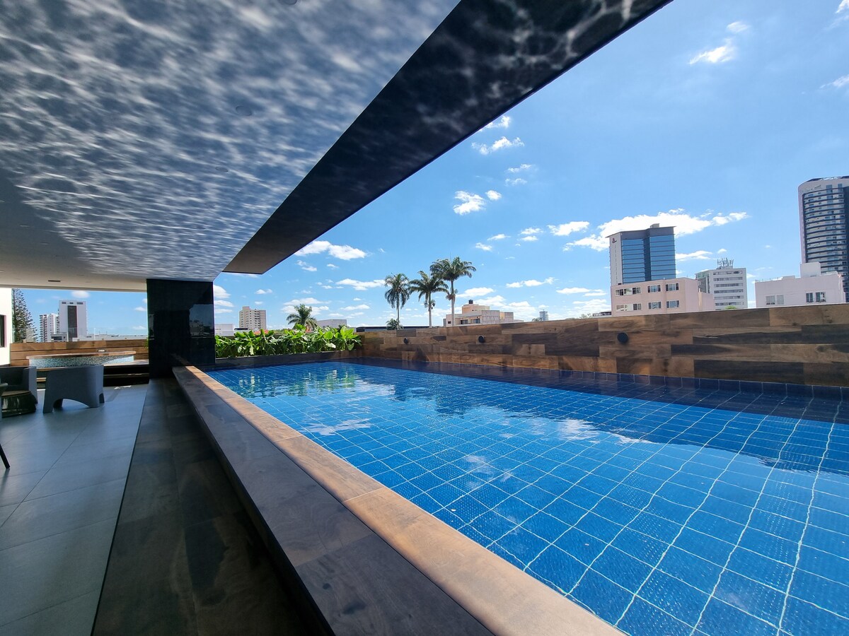 Este lujoso monoambiente está ubicado en el Barrio Equipetrol, Edificio Sky Elite, a una cuadra del Hotel Los Tajibos; representa la combinación perfecta de exclusividad y comodidades de primera clase en la ciudad de Santa Cruz de la Sierra, rodeada de restaurantes, tiendas, cafeterías, farmacias y supermercados. El edificio ofrece más de 3.000 metros cuadrados de áreas sociales que incluyen un moderno gimnasio, extensa piscina, churrasquera, cowork, sala de cine privada, sauna e hidromasaje.