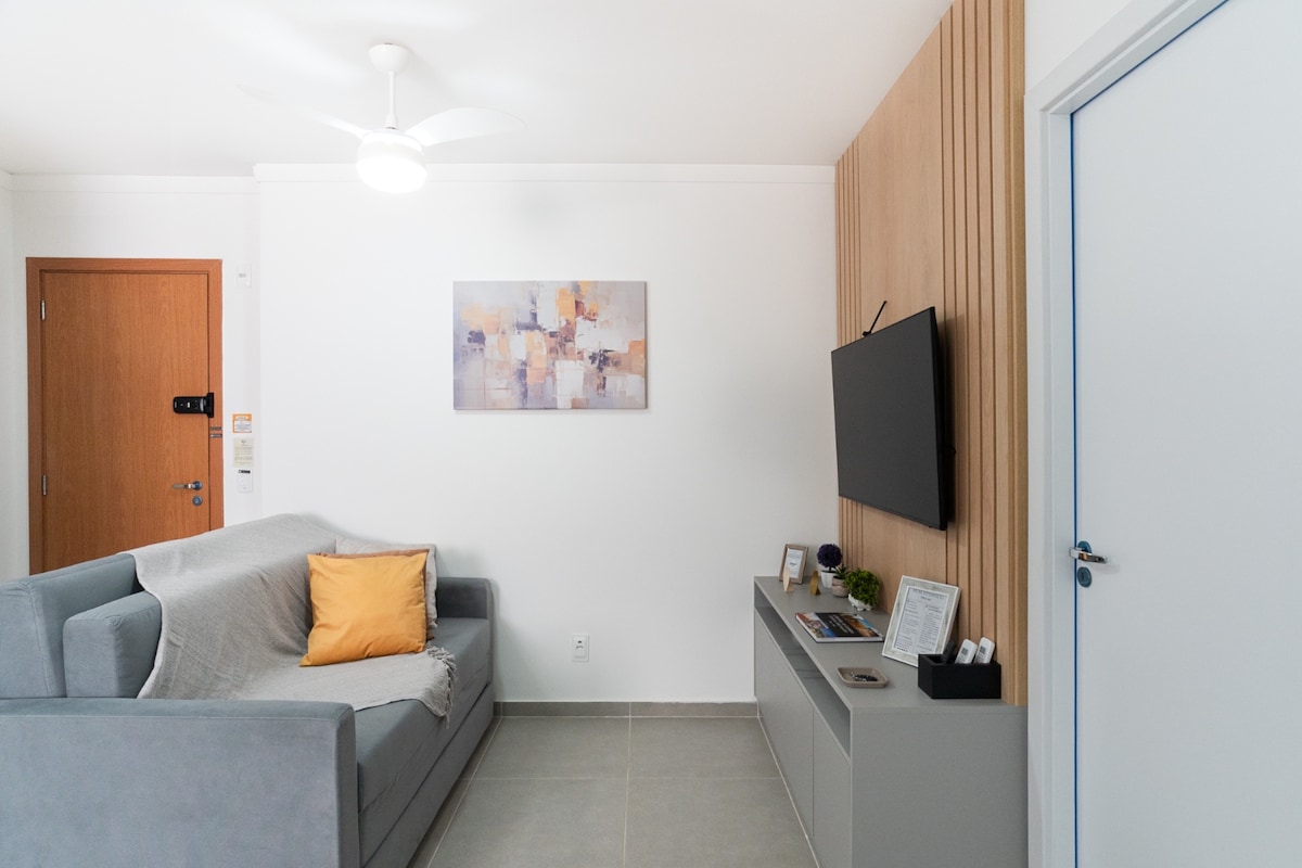 📍 ¡Haz todo a pie! * Supermercado de 50 m, farmacia, pizzería, restaurante y hospital Santa Casa a 300 m. - Cerradura electrónica - Puerta de enlace remoto 2 dormitorios con cama Castor y equipados con aire acondicionado frío y caliente. Comedor y sala de estar con sofá cama Castor, TV inteligente de 50 pulgadas y ventilador de techo. - Cocina equipada. - Lava e Seca en el departamento. - Garaje cerrado y demarcado Vaga. - Gimnasio de entrenamiento