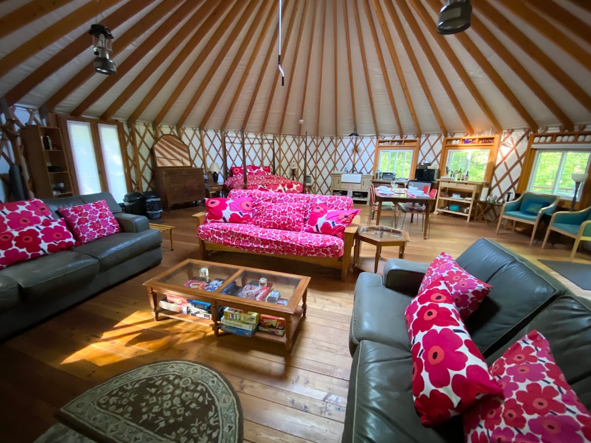 Disfruta de una escapada única a la naturaleza y relájate en un entorno boscoso pacífico de 10,3 acres en nuestra yurta de 30 pies de diámetro, con capacidad para 4 personas en North Guilford, CT. Esta elevada morada espectacular ofrece soledad y una gran terraza con cómodas sillas y vistas al bosque. A la sombra y fresco en verano, con aire acondicionado y ventiladores disponibles. Esta yurta ofrece un maravilloso respiro del mundo agitado. Perfecto para los amantes de la naturaleza con un arroyo cercano y kilómetros de senderos para senderismo y ciclismo de montaña.